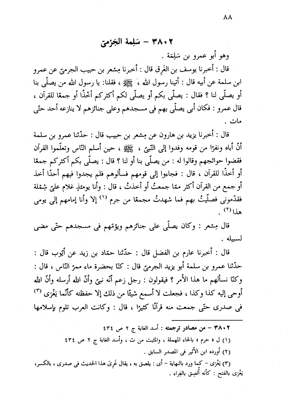 قال: أخبرنا يوسف بن الغَرِق قال: أخبرنا مِشعر بن حبيب الجرمىّ عن عمرو ابن سلمة عن أبيه قال: أتينا رسول الله، -صلى الله عليه وسلم-، فقلنا: يا رسول الله من يصلّى بنا أو يصلّى لنا؟ فقال: يصلّى بكم أو يصلّى لكم أكثركم أخْذًا أو جمعًا للقرآن، قال عمرو: فكان أبي يصلّى بهم فى مسجدهم وعلى جنائزهم لا ينازعه أحد حتّى مات.