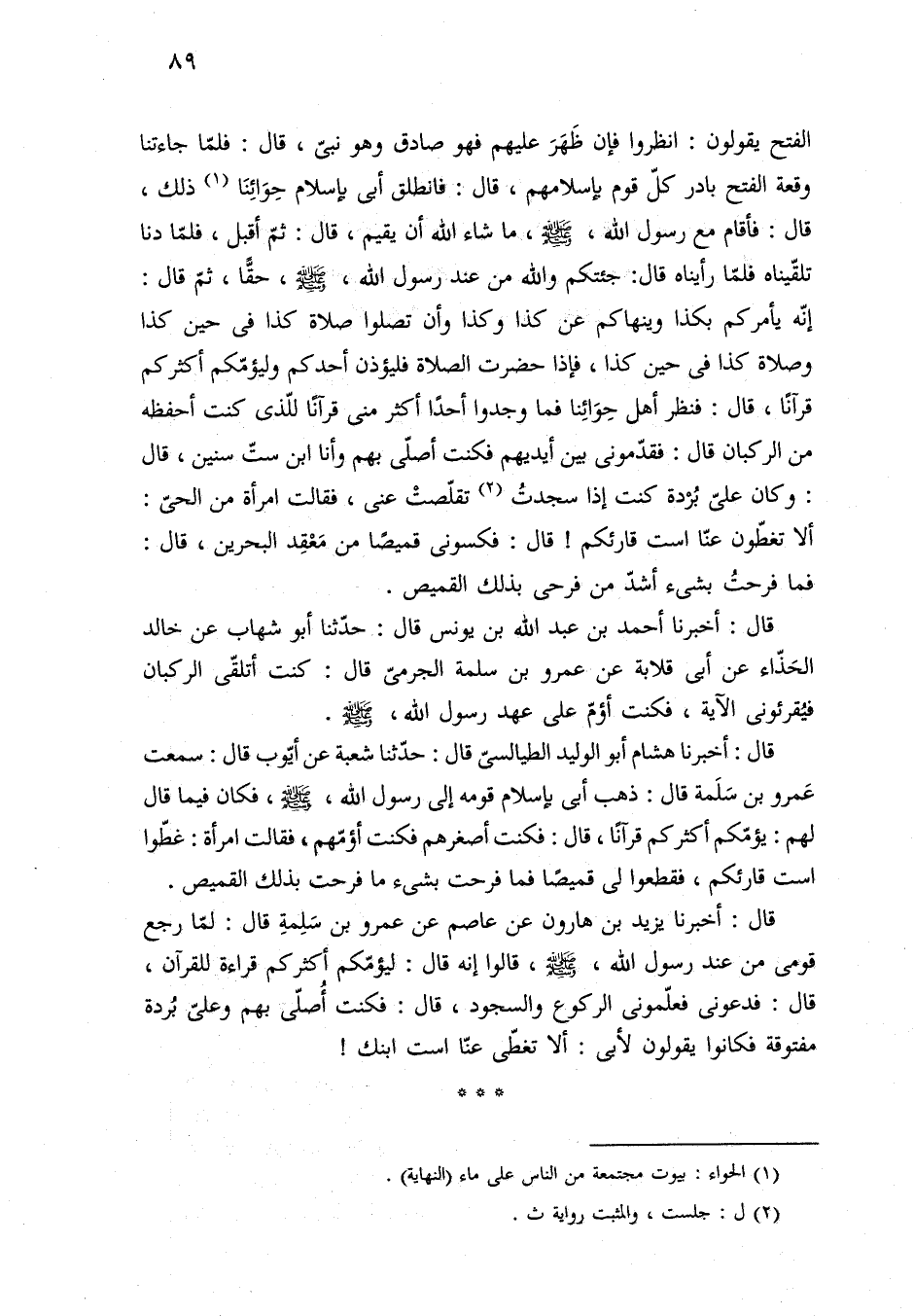 قال: أخبرنا هشام أبو الوليد الطيالسيّ قال: حدّثنا شعبة عن أيّوب قال: سمعت عَمرو بن سَلَمة قال: ذهب أبي بإسلام قومه إلى رسول الله، -صلى الله عليه وسلم-، فكان فيما قال لهم: يؤمّكم أكثركم قرآنًا، قال: فكنت أصغرهم فكنت أؤمّهم، فقالت امرأة: غطّوا است قارئكم، فقطعوا لى قميصًا فما فرحت بشئ ما فرحت بذلك القميص.