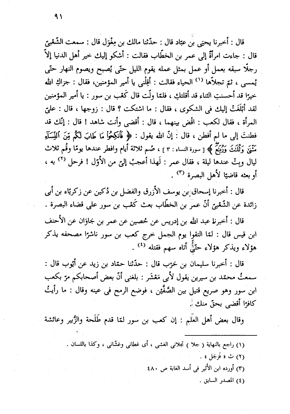 قال: أخبرنا يحيَى بنَ عبّاد قال: حدّثنا مالك بن مِغْوَلْ قال: سمعت الشّعْبيّ قال: جاءت امرأةٌ إلى عمر بن الخطّاب فقالت: أشكو إليك خير أهل الدنيا إِلَّا رجلًا سبقه بعمل أو عمل بمثل عمله يقوم الليل حتّىْ يُصبح ويصوم النهار حتّى يُمسى، ثمّ تجلّاها (¬١) الحياء فقالت: أقِلْنى يا أمير المؤمنين، فقال: جزاكِ الله خيرًا قد أحسنتِ الثناء قد أقلتكِ، فلمّا ولّت قال كَعْب بن سور: يا أمير المؤمنين لقد أبْلَغَتْ إليك فى الشكوى، فقال: ما اشتكت؟ قال: زوجها، قال: عليّ المرأة، فقال لكعب: اقْض بينهما، قال: أقضى وأنت شاهد! قال: إنّك قد فطنتَ إلى ما لم أفطن، قال إنّ الله يقول: {فَانْكِحُوا مَا طَابَ لَكُمْ مِنَ النِّسَاءِ مَثْنَى وَثُلَاثَ وَرُبَاعَ} [النساء: ٣]، صُم ثلاثة أيام وافطر عندها يومًا وقُم ثلاث ليال وبِتْ عندها ليلة، فقال عمر: لَهذا أعجبُ إلىّ من الأوّل! فرحل (¬٢) به، أو بعثه قاضيًا لأهل البصرة (¬٣).