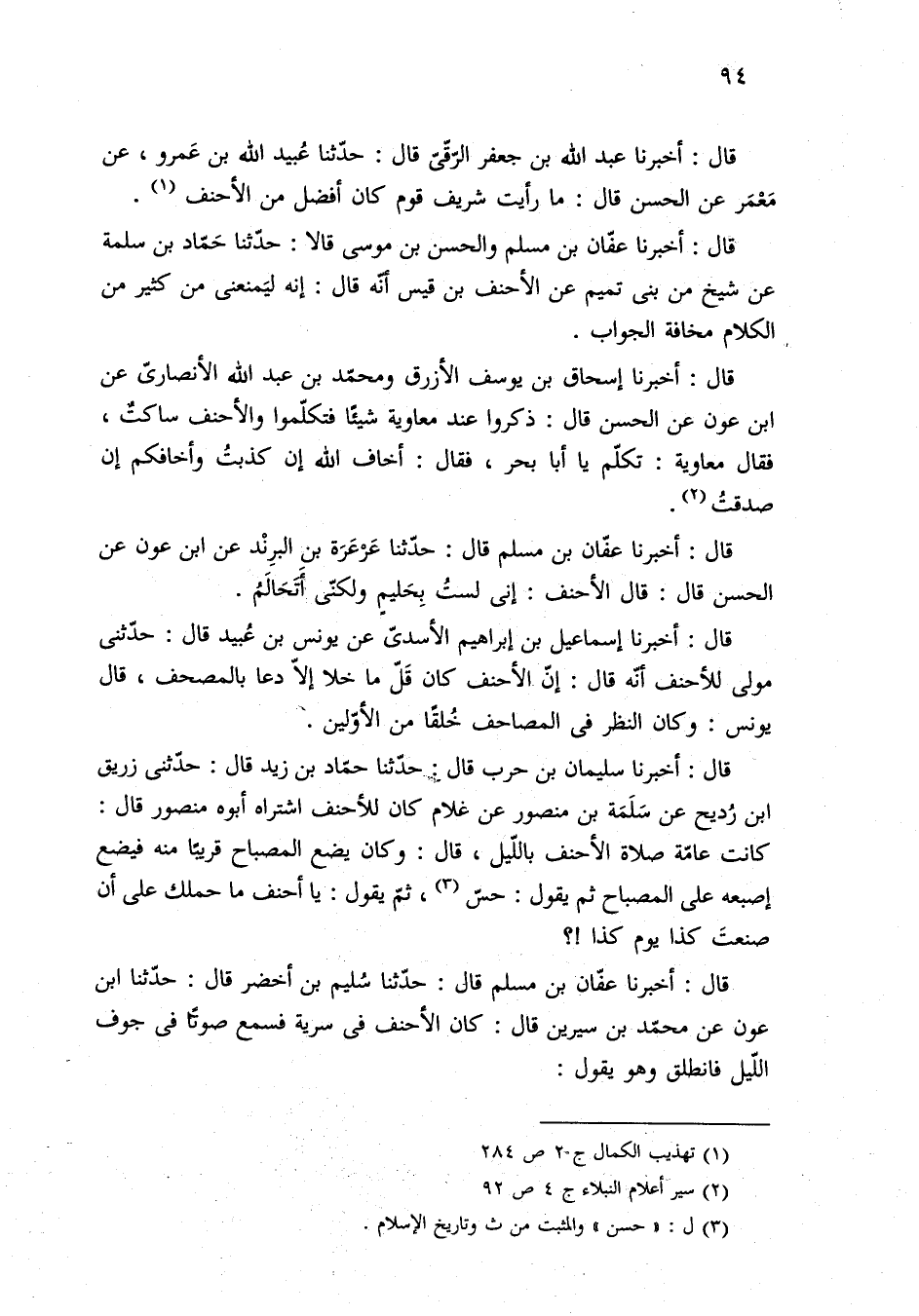 قال: أخبرنا عفّان بن مسلم قال: حدّثنا سُليم بن أخضر قال: حدّثنا ابن عون عن محمّد بن سيرين قال: كان الأحنف فى سرية فسمع صوتًا فى جوف اللّيل فانطلق وهو يقول: