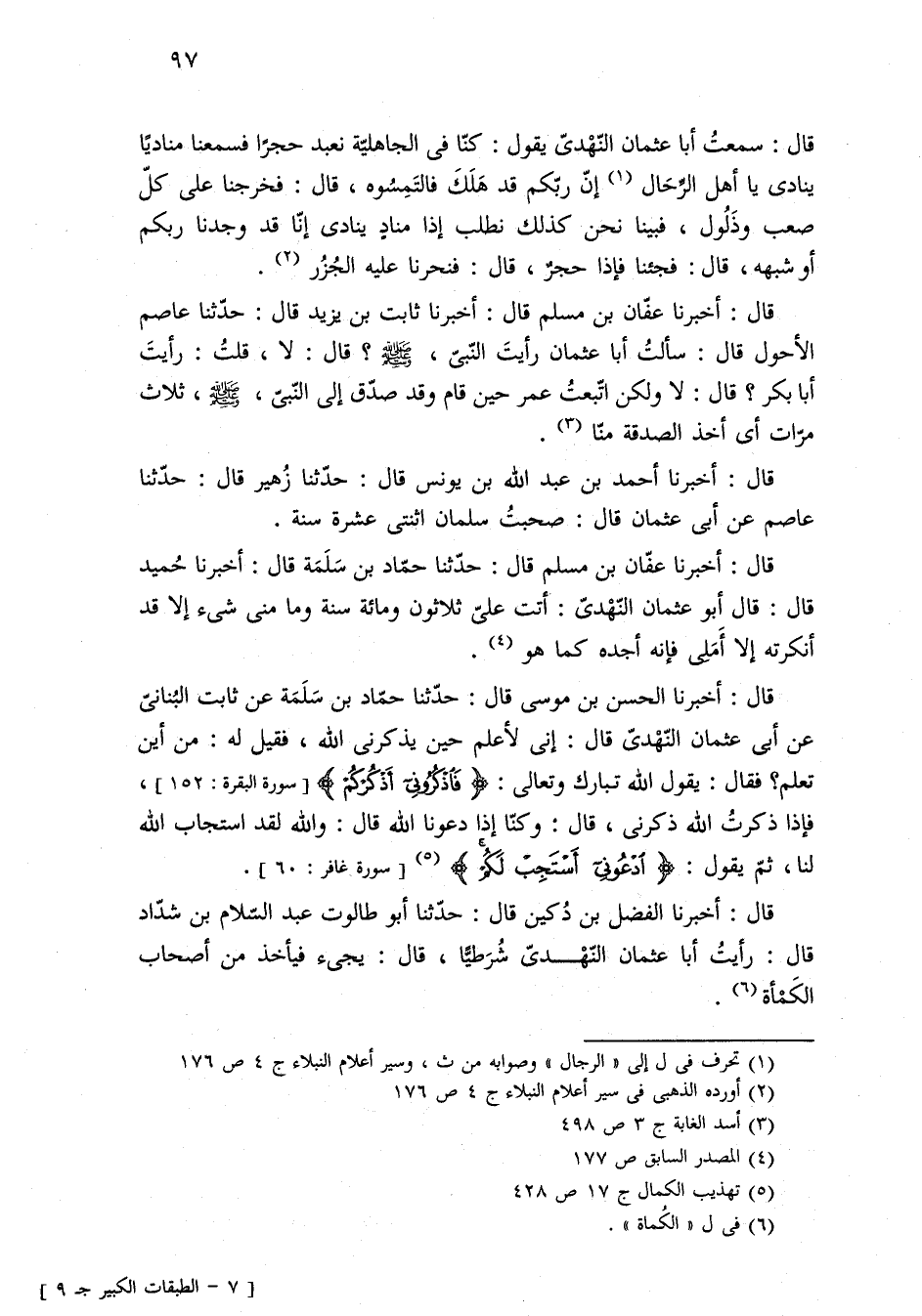 قال: أخبرنا عفّان بن مسلم قال: أخبرنا ثابت بن يزيد قال: حدَّثَنَا عاصم الأحول قال: سألتُ أبا عثمان رأيتَ النّبىّ، -صلى الله عليه وسلم-؟ قال: لا، قلتُ: رأيتَ أبا بكر؟ قال: لا ولكن اتّبعتُ عمر حين قام وقد صدّق إلى النّبىّ، -صلى الله عليه وسلم-، ثلاث مرّات أى أخذ الصدقة منّا (¬٣).