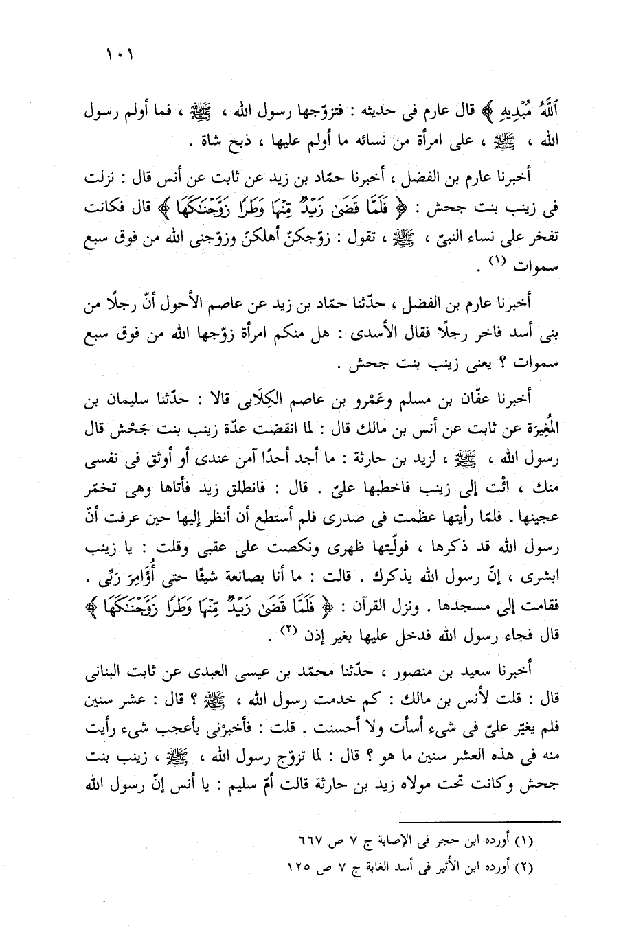 أخبرنا عفّان بن مسلم وعَمْرو بن عاصم الكِلَابى قالا: حدّثنا سليمان بن المُغِيرَة عن ثابت عن أنس بن مالك قال: لما انقضت عدّة زينب بنت جَحْش قال رسول الله، -صلى الله عليه وسلم-، لزيد بن حارثة: ما أجد أحدًا آمن عندى أو أوثق في نفسى منك، ائْت إلى زينب فاخطبها عليّ. قال: فانطلق زيد فأتاها وهى تخمّر عجينها. فلمّا رأيتها عظمت في صدرى فلم أستطع أن أنظر إليها حين عرفت أنّ رسول الله قد ذكرها، فولّيتها ظهرى ونكصت على عقبى وقلت: يا زينب ابشرى، إنّ رسول الله يذكرك. قالت: ما أنا بصانعة شيئًا حتى أُؤَامِرَ رَبِّى. فقامت إلى مسجدها. ونزل القرآن: {فَلَمَّا قَضَى زَيْدٌ مِنْهَا وَطَرًا زَوَّجْنَاكَهَا} قال فجاء رسول الله فدخل عليها بغير إذن (¬٢).