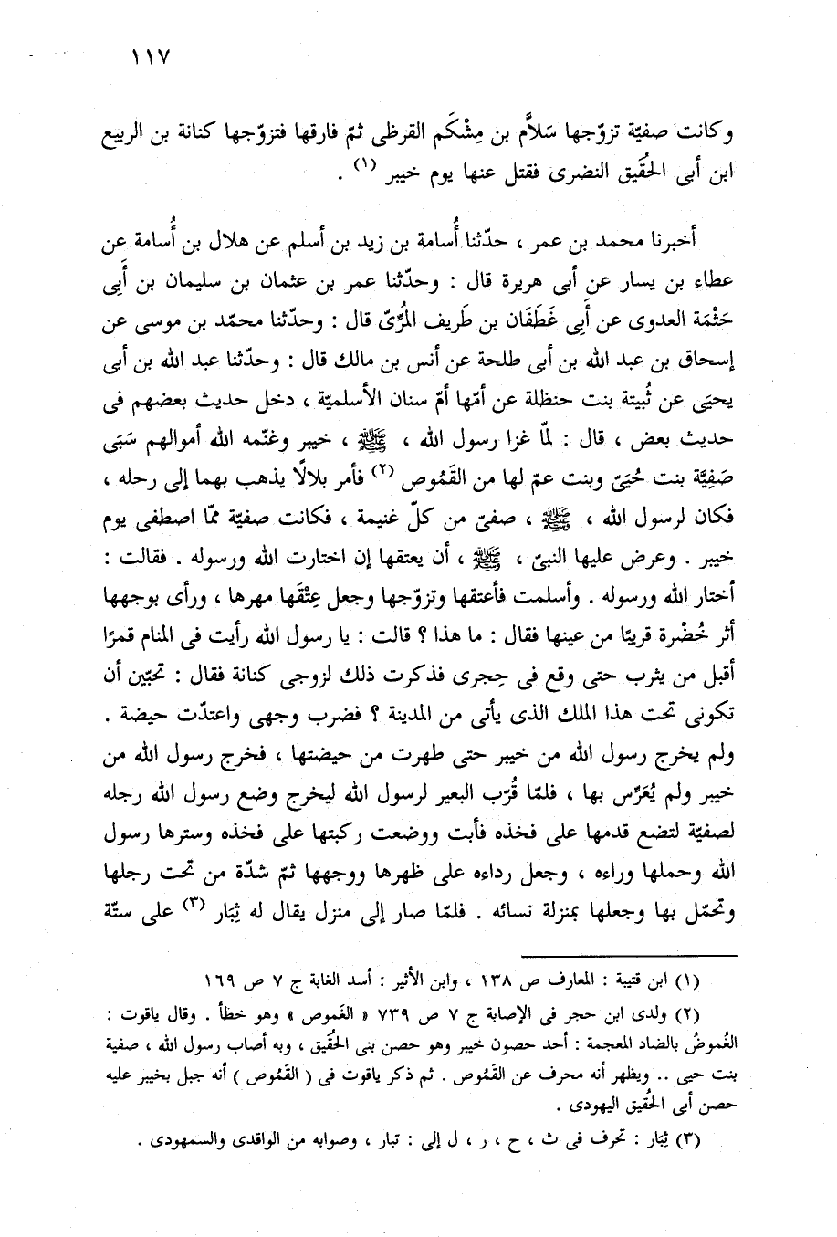 أخبرنا محمد بن عمر، حدّثنا أُسامة بن زيد بن أسلم عن هلال بن أُسامة عن عطاء بن يسار عن أبي هريرة قال: وحدّثنا عمر بن عثمان بن سليمان بن أَبِى حَثْمَة العدوى عن أَبِى غَطَفَان بن طَريف المُرِّيّ قال: وحدّثنا محمّد بن موسى عن إسحاق بن عبد الله بن أبي طلحة عن أنس بن مالك قال: وحدّثنا عبد الله بن أبي يحيَى عن ثُبيتة بنت حنظلة عن أمّها أمّ سنان الأسلميّة، دخل حديث بعضهم في حديث بعض، قال: لمّا غزا رسول الله، -صلى الله عليه وسلم-، خيبر وغنّمه الله أموالهم سَبَى صَفِيَّة بنت حُيَيّ وبنت عمّ لها من القَمُوص (¬٢) فأمر بلالًا يذهب بهما إلى رحله، فكان لرسول الله، -صلى الله عليه وسلم-، صفيّ من كلّ غنيمة، فكانت صفيّة ممّا اصطفى يوم خيبر. وعرض عليها النبيّ، -صلى الله عليه وسلم-، أن يعتقها إن اختارت الله ورسوله. فقالت: أختار الله ورسوله. وأسلمت فأعتقها وتزوّجها وجعل عِتْقَها مهرها، ورأى بوجهها أثر خُضرة قريبًا من عينها فقال: ما هذا؟ قالت: يا رسول الله رأيت في المنام قمرًا أقبل من يثرب حتى وقع في حِجرى فذكرت ذلك لزوجى كنانة فقال: تحبّين أن تكونى تحت هذا الملك الذى يأتى من المدينة؟ فضرب وجهى واعتدّت حيضة. ولم يخرج رسول الله من خيبر حتى طهرت من حيضتها، فخرج رسول الله من خيبر ولم يُعَرِّس بها، فلمّا قُرّب البعير لرسول الله ليخرج وضع رسول الله رجله لصفيّة لتضع قدمها على فخذه فأبت ووضعت ركبتها على فخذه وسترها رسول الله وحملها وراءه، وجعل رداءه على ظهرها ووجهها ثمّ شدّة من تحت رجلها وتحمّل بها وجعلها بمنزلة نسائه. فلمّا صار إلى منزل يقال له ثِبَار (¬٣) على ستّة