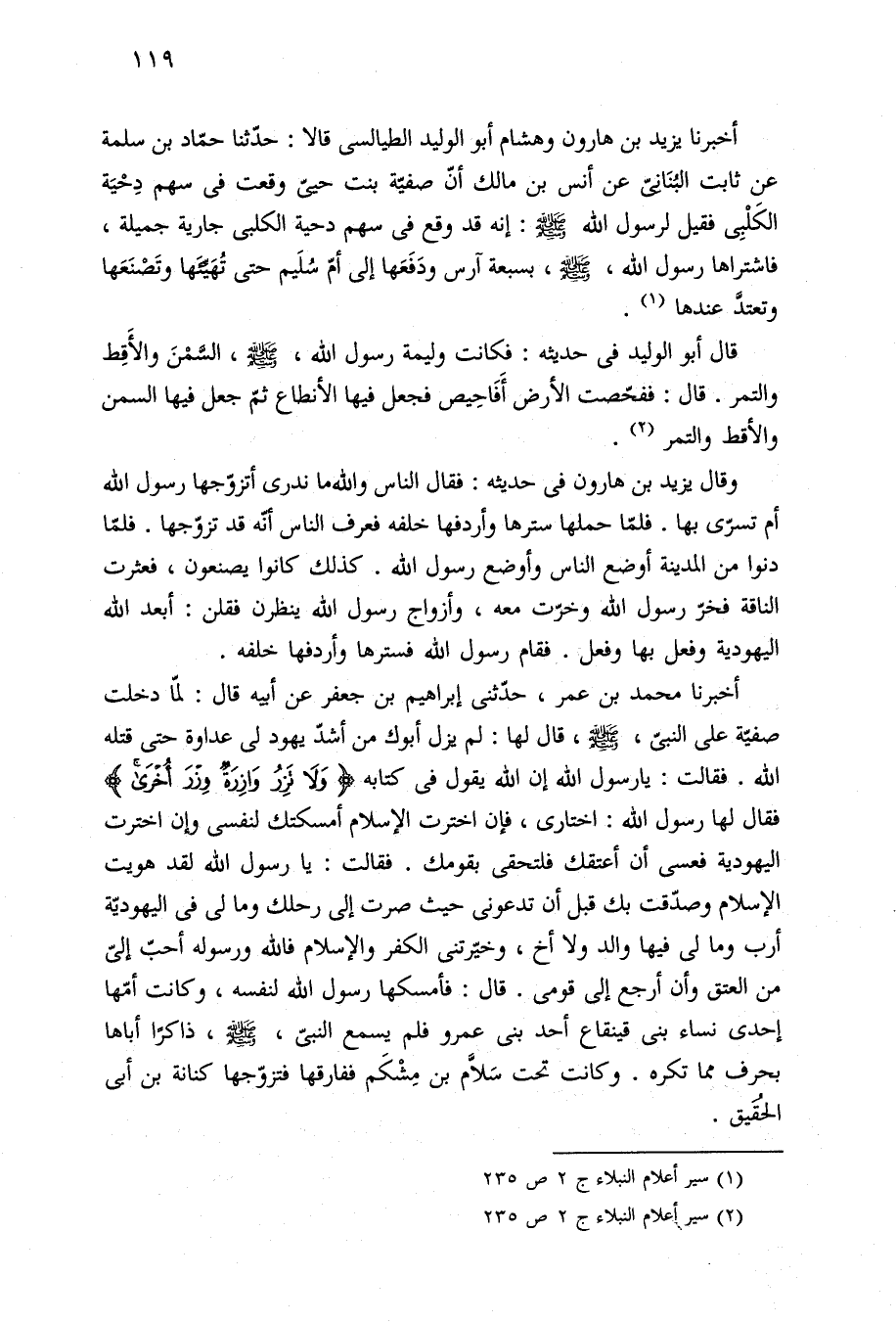 أخبرنا يزيد بن هارون وهشام أبو الوليد الطيالسى قالا: حدّثنا حمّاد بن سلمة عن ثابت البُنَانِيّ عن أنس بن مالك أنّ صفيّة بنت حييّ وقعت في سهم دِحْيَة الكَلْبِى فقيل لرسول الله -صلى الله عليه وسلم-: إنه قد وقع في سهم في حية الكلبى جارية جميلة، فاشتراها رسول الله، -صلى الله عليه وسلم-، بسبعة آرس ودَفَعَها إلى أمّ سُلَيم حتى تُهَيِّئَها وتَصْنَعَها وتعتدَّ عندها (¬١).