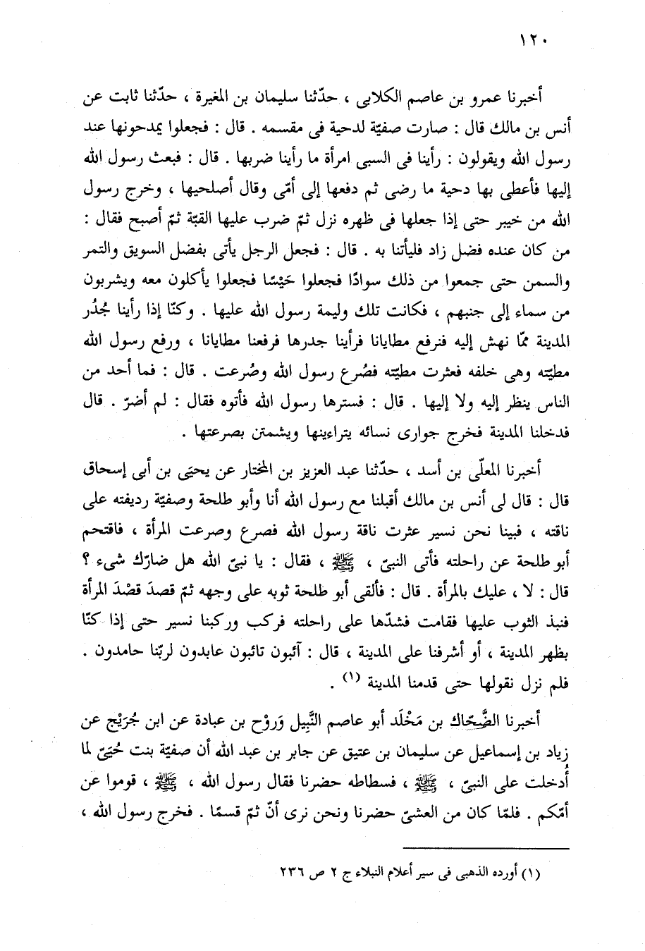 أخبرنا المعلّى بن أسد، حدّثنا عبد العزيز بن المختار عن يحيَى بن أبي إسحاق قال: قال لى أنس بن مالك أقبلنا مع رسول الله أنا وأبو طلحة وصفيّة رديفته على ناقته، فبينا نحن نسير عثرت ناقة رسول الله فصرع وصرعت المرأة، فاقتحم أبو طلحة عن راحلته فأتى النبيّ، -صلى الله عليه وسلم-، فقال: يا نبيّ الله هل ضارّك شئ؟ قال: لا، عليك بالمرأة. قال: فألقى أبو طلحة ثوبه على وجهه ثمّ قصدَ قصْدَ المرأة فنبذ الثوب عليها فقامت فشدّها على راحلته فركب وركبنا نسير حتى إذا كنّا بظهر المدينة، أو أشرفنا على المدينة، قال: آئبون تائبون عابدون لربّنا حامدون. فلم نزل نقولها حتى قدمنا المدينة (¬١).