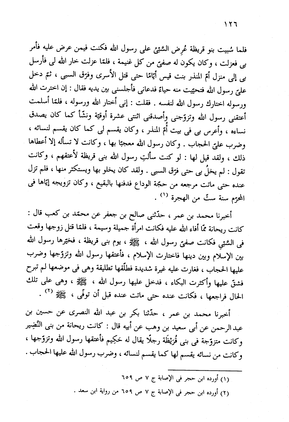 أخبرنا محمد بن عمر، حدّثنا بكر بن عبد الله النصرى عن حسين بن عبد الرحمن عن أبي سعيد بن وهب عن أبيه قال: كانت ريحانة من بنى النَّضِير وكانت متزوّجة في بنى قُرَيْظَة رجلًا يقال له حَكِيم فأعتقها رسول الله وتزوّجها، وكانت من نسائه يقسم لها كما يقسم لنسائه، وضرب رسول الله عليها الحجاب.