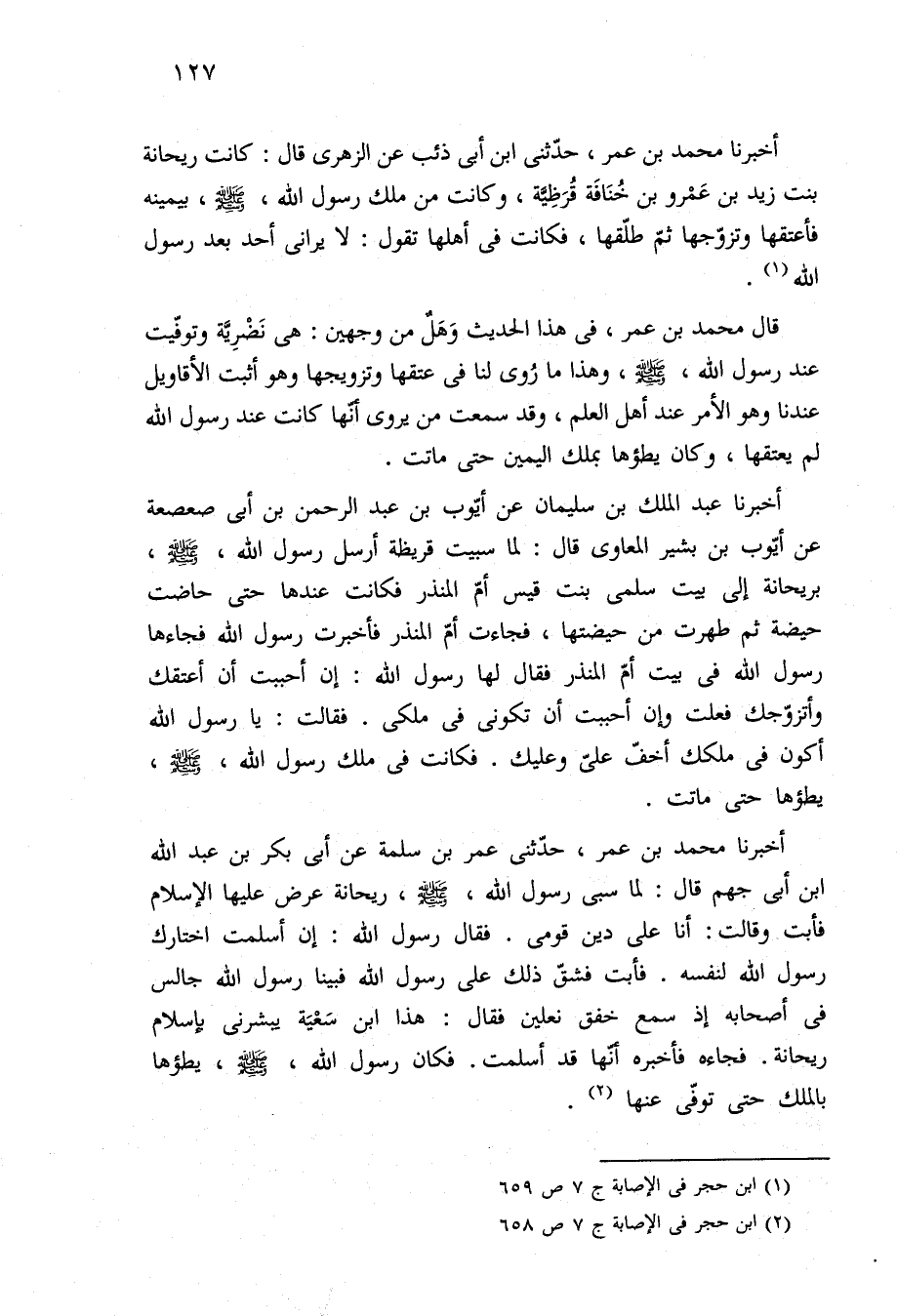 أخبرنا محمد بن عمر، حدّثنى عمر بن سلمة عن أبي بكر بن عبد الله بن أبي جهم قال: لما سبى رسول الله، -صلى الله عليه وسلم-، ريحانة عرض عليها الإسلام فأبت وقالت: أنا على دين قومى. فقال رسول الله: إن أسلمت اختارك رسول الله لنفسه. فأبت فشقّ ذلك على رسول الله فبينا رسول الله جالس في أصحابه إذ سمع خفق نعلين فقال: هذا ابن سَعْيَة يبشرنى بإسلام ريحانة. فجاءه فأخبره أنّها قد أسلمت. فكان رسول الله، -صلى الله عليه وسلم-، يطؤها بالملك حتى توفّى عنها (¬٢).