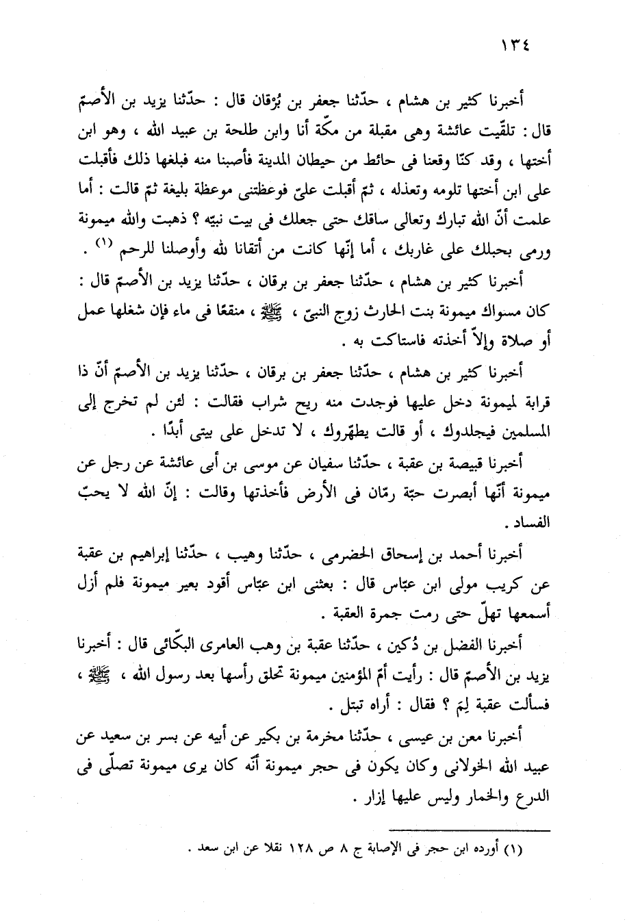 أخبرنا الفضل بن دُكين، حدّثنا عقبة بن وهب العامرى البكّائى قال: أخبرنا يزيد بن الأصمّ قال: رأيت أمّ المؤمنين ميمونة تحلق رأسها بعد رسول الله، -صلى الله عليه وسلم-، فسألت عقبة لِمَ؟ فقال: أراه تبتل.