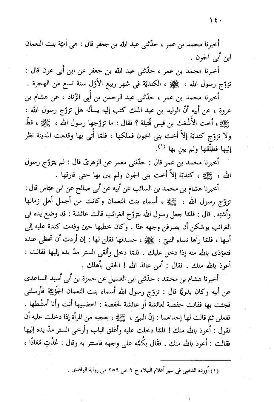 أخبرنا هشام بن محمد بن السائب عن أبيه عن أبي صالح عن ابن عبّاس قال: تزوّج رسول الله، -صلى الله عليه وسلم-، أسماء بنت النعمان وكانت من أجمل أهل زمانها وأشبّه. قال: فلمّا جعل رسول الله يتزوّج الغرائب قالت عائشة: قد وضع يده في الغرائب يوشكن أن يصرفن وجهه عنّا. وكان خطها حين وفدت كندة عليه إلى أبيها، فلمّا رآها نساء النبيّ، -صلى الله عليه وسلم-، حسدنها فقلن لها: إن أردت أن تحظى عنده فتعوّذى بالله منه إذا دخل عليك. فلمّا دخل وألقى الستر مدّ يده إليها فقالت: أعوذ بالله منك. فقال: أمن عائذ الله! الحقى بأهلك.