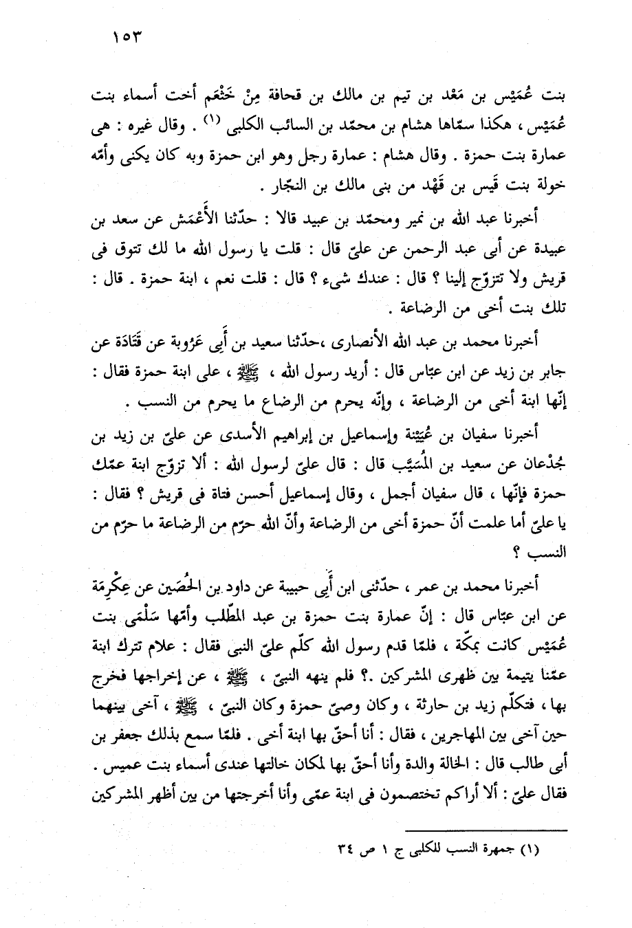 أخبرنا سفيان بن عُيَيْنة وإسماعيل بن إبراهيم الأسدى عن عليّ بن زيد بن جُدْعان عن سعيد بن المُسَيَّب قال: قال عليّ لرسول الله: ألا تزوّج ابنة عمّك حمزة فإنّها، قال سفيان أجمل، وقال إسماعيل أحسن فتاة في قريش؟ فقال: يا عليّ أما علمت أنّ حمزة أخى من الرضاعة وأنّ الله حرّم من الرضاعة ما حرّم من النسب؟