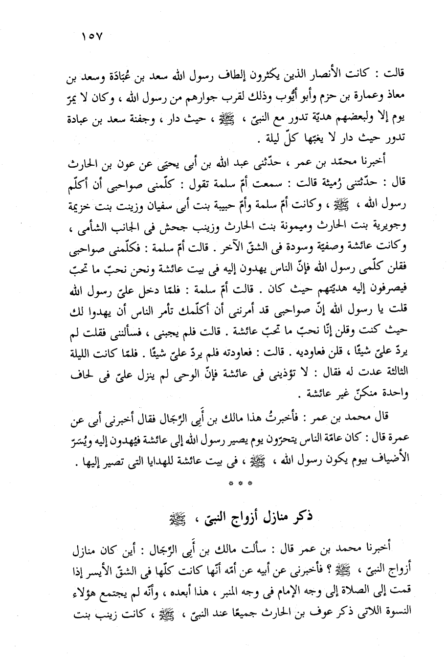 أخبرنا محمد بن عمر قال: سألت مالك بن أَبِى الرِّجَال: أين كان منازل أزواج النبيّ، -صلى الله عليه وسلم-؟ فأخبرنى عن أبيه عن أمّه أنّها كانت كلّها في الشقّ الأيسر إذا قمت إلى الصلاة إلى وجه الإمام في وجه المنبر، هذا أبعده، وأنّه لم يجتمع هؤلاء النسوة اللاتى ذكر عوف بن الحارث جميعًا عند النبيّ، -صلى الله عليه وسلم-، كانت زينب بنت