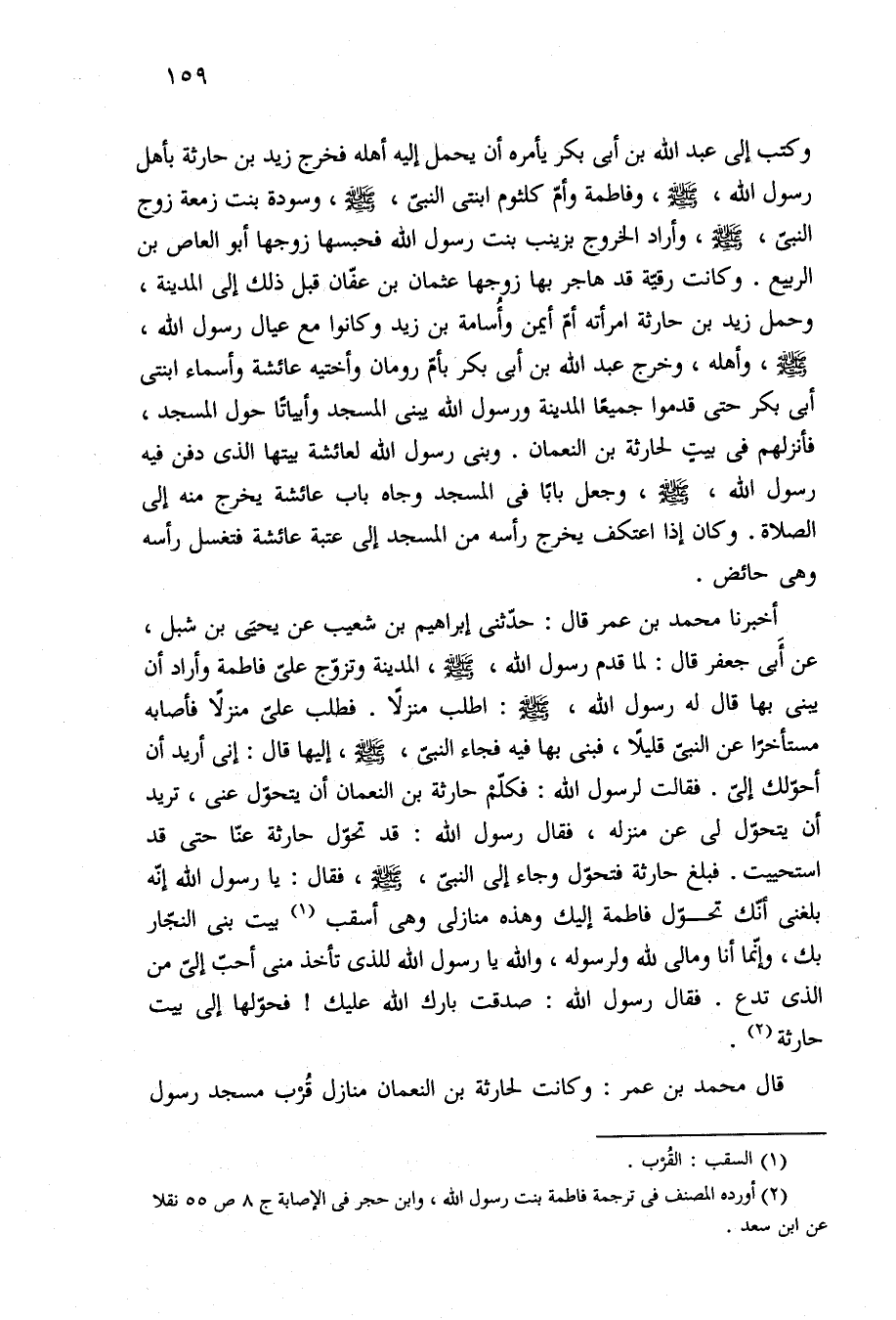 أخبرنا محمد بن عمر قال: حدّثنى إبراهيم بن شعيب عن يحيَى بن شبل، عن أَبى جعفر قال: لما قدم رسول الله، -صلى الله عليه وسلم-، المدينة وتزوّج عليّ فاطمة وأراد أن يبنى بها قال له رسول الله، -صلى الله عليه وسلم-: اطلب منزلًا. فطلب عليّ منزلًا فأصابه مستأخرًا عن النبيّ قليلًا، فبنى بها فيه فجاء النبيّ، -صلى الله عليه وسلم-، إليها قال: إنى أريد أن أحوّلك إليّ. فقالت لرسول الله: فكلّمْ حارثة بن النعمان أن يتحوّل عنى، تريد أن يتحوّل لى عن منزله، فقال رسول الله: قد تحوّل حارثة عنّا حتى قد استحييت. فبلغ حارثة فتحوّل وجاء إلى النبيّ، -صلى الله عليه وسلم-، فقال: يا رسول الله إنّه بلغنى أنّك تحوّل فاطمة إليك وهذه منازلى وهى أسقب (¬١) بيت بنى النجّار بك، وإنّما أنا ومالى لله ولرسوله، والله يا رسول الله للذى تأخذ منى أحبّ إليّ من الذى تدع. فقال رسول الله: صدقت بارك الله عليك! فحوّلها إلى بيت حارثة (¬٢).
