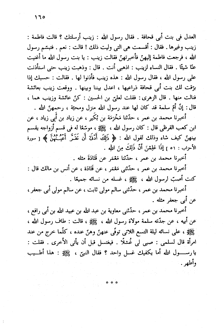 أخبرنا محمد بن عمر، حدّثنا مَخْرَمَة بن بُكَير، عن زياد بن أَبِى زياد، عن ابن كعب القرظى قال: كان رسول الله، -صلى الله عليه وسلم-، موسّعًا له في قسم أزواجه يقسم بينهنّ كيف شاء وذلك لقول الله: {ذَلِكَ أَدْنَى أَنْ تَقَرَّ أَعْيُنُهُنَّ} [سورة الأحزاب: ٥١] إذَا عَلِمْنَ أنّ ذَلِكَ مِنَ اللهِ.