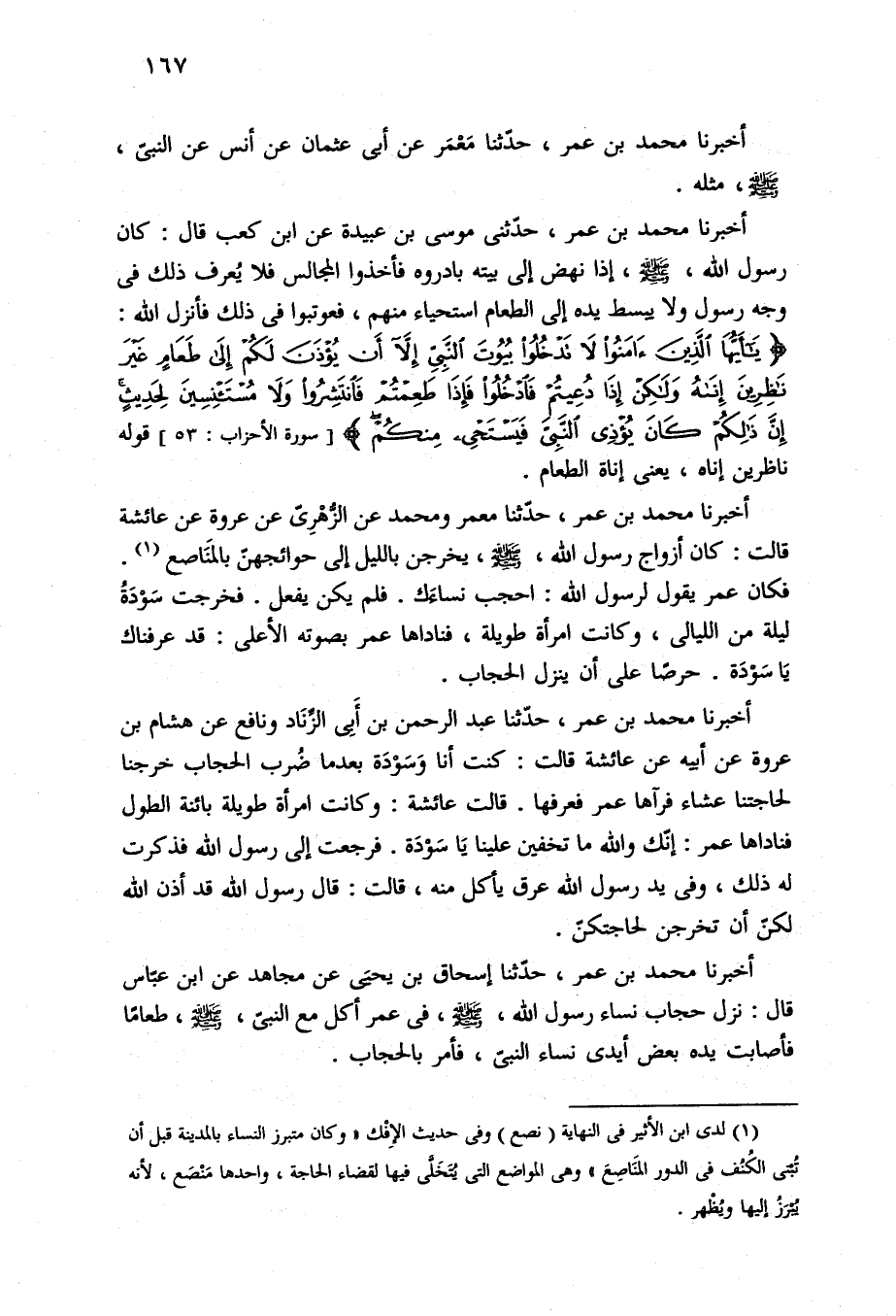 أخبرنا محمد بن عمر، حدّثنا إسحاق بن يحيَى عن مجاهد عن ابن عبّاس قال: نزل حجاب نساء رسول الله، -صلى الله عليه وسلم-، في عمر أكل مع النبيّ، -صلى الله عليه وسلم-، طعامًا فأصابت يده بعض أيدى نساء النبيّ، فأمر بالحجاب.