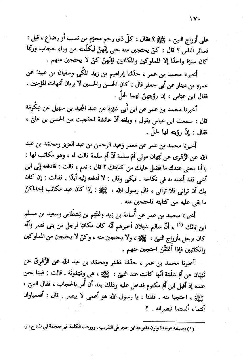 على أزواج النبيّ، -صلى الله عليه وسلم-؟ فقال: كلّ ذى رحم محرّم من نسب أو رضاع، قيل: فسائر الناس؟ قال: كنّ يحتجبن منه حتى إنّهنّ ليكلّمنه من وراء حجاب وربّما كان سترًا واحدًا إلا المملوكين والمكاتبين فإنّهنّ كنّ لا يحتجبن فهم.