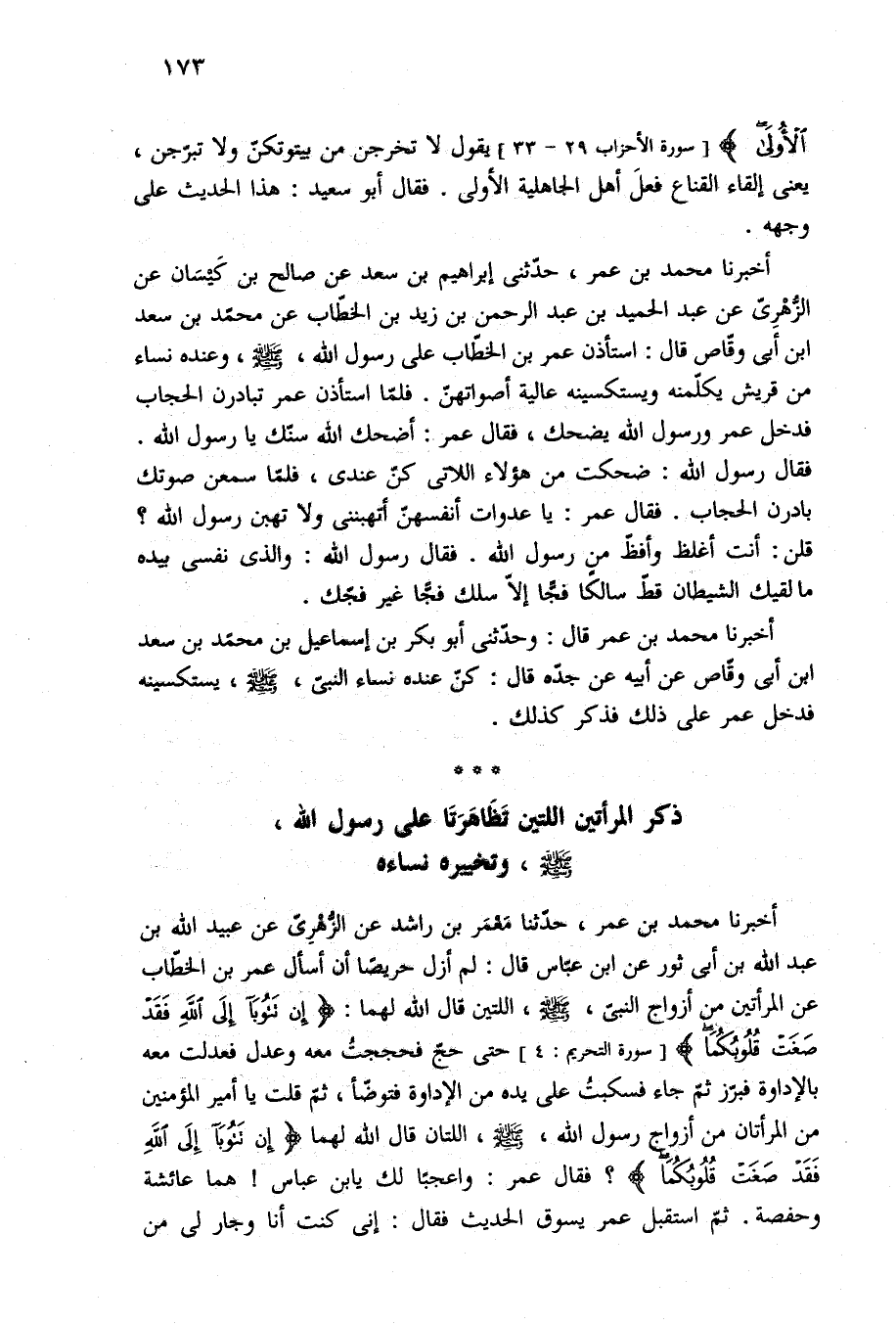أخبرنا محمد بن عمر، حدّثنا مَعْمَر بن راشد عن الزُّهْرِيّ عن عبيد الله بن عبد الله بن أبي ثور عن ابن عبّاس قال: لم أزل حريصًا أن أسأل عمر بن الخطّاب عن المرأتين من أزواج النبيّ، -صلى الله عليه وسلم-، اللتين قال الله لهما: {إِنْ تَتُوبَا إِلَى اللَّهِ فَقَدْ صَغَتْ قُلُوبُكُمَا} [سورة التحريم: ٤] حتى حجّ فحججتُ معه وعدل فعدلت معه بالإداوة فبرّز ثمّ جاء فسكبتُ على يده من الإداوة فتوضّأ، ثمّ قلت يا أمير المؤمنين من المرأتان من أزواج رسول الله، -صلى الله عليه وسلم-، اللتان قال الله لهما {إِنْ تَتُوبَا إِلَى اللَّهِ فَقَدْ صَغَتْ قُلُوبُكُمَا}؟ فقال عمر: واعجبًا لك يا بن عباس! هما عائشة وحفصة. ثمّ استقبل عمر يسوق الحديث فقال: إنى كنت أنا وجار لى من