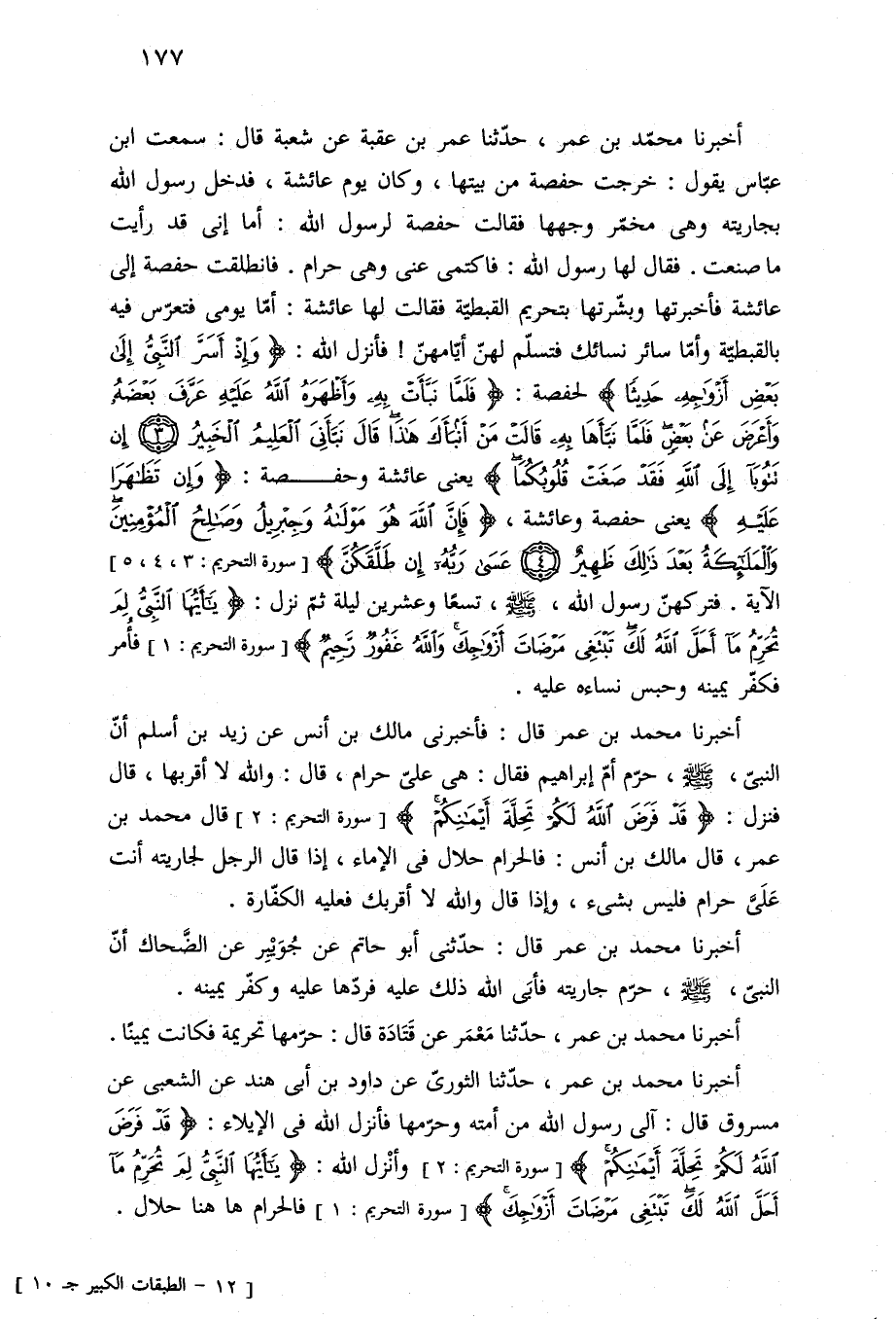 أخبرنا محمّد بن عمر، حدّثنا عمر بن عقبة عن شعبة قال: سمعت ابن عبّاس يقول: خرجت حفصة من بيتها، وكان يوم عائشة، فدخل رسول الله بجاريته وهى مخمّر وجهها فقالت حفصة لرسول الله: أما إنى قد رأيت ما صنعت. فقال لها رسول الله: فاكتمى عنى وهى حرام. فانطلقت حفصة إلى عائشة فأخبرتها وبشّرتها بتحريم القبطيّة فقالت لها عائشة: أمّا يومى فتعرّس فيه بالقبطيّة وأمّا سائر نسائك فتسلّم لهنّ أيّامهنّ! فأنزل الله: {وَإِذْ أَسَرَّ النَّبِيُّ إِلَى بَعْضِ أَزْوَاجِهِ حَدِيثًا} لحفصة: {فَلَمَّا نَبَّأَتْ بِهِ وَأَظْهَرَهُ اللَّهُ عَلَيْهِ عَرَّفَ بَعْضَهُ وَأَعْرَضَ عَنْ بَعْضٍ فَلَمَّا نَبَّأَهَا بِهِ قَالَتْ مَنْ أَنْبَأَكَ هَذَا قَالَ نَبَّأَنِيَ الْعَلِيمُ الْخَبِيرُ (٣) إِنْ تَتُوبَا إِلَى اللَّهِ فَقَدْ صَغَتْ قُلُوبُكُمَا} يعنى عائشة وحفصة: {وَإِنْ تَظَاهَرَا عَلَيْهِ} يعنى حفصة وعائشة، {فَإِنَّ اللَّهَ هُوَ مَوْلَاهُ وَجِبْرِيلُ وَصَالِحُ الْمُؤْمِنِينَ وَالْمَلَائِكَةُ بَعْدَ ذَلِكَ ظَهِيرٌ (٤) عَسَى رَبُّهُ إِنْ طَلَّقَكُنَّ} [سورة التحريم: ٣، ٤، ٥] الآية. فتركهنّ رسول الله، -صلى الله عليه وسلم-، تسعًا وعشرين ليلة ثمّ نزل: {يَاأَيُّهَا النَّبِيُّ لِمَ تُحَرِّمُ مَا أَحَلَّ اللَّهُ لَكَ تَبْتَغِي مَرْضَاتَ أَزْوَاجِكَ وَاللَّهُ غَفُورٌ رَحِيمٌ} [سورة التحريم: ١] فأمر فكفّر يمينه وحبس نساءه عليه.