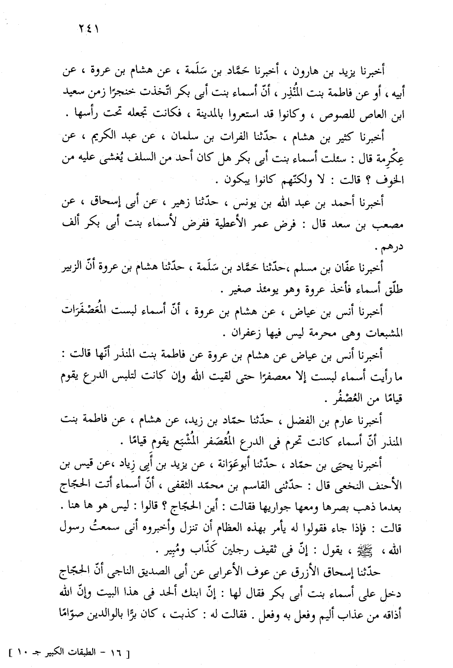 أخبرنا أنس بن عياض عن هشام بن عروة عن فاطمة بنت المنذر أنّها قالت: ما رأيت أسماء لبست إلا معصفرًا حتى لقيت الله وإن كانت لتلبس الدرع يقوم قيامًا من العُصْفُر.