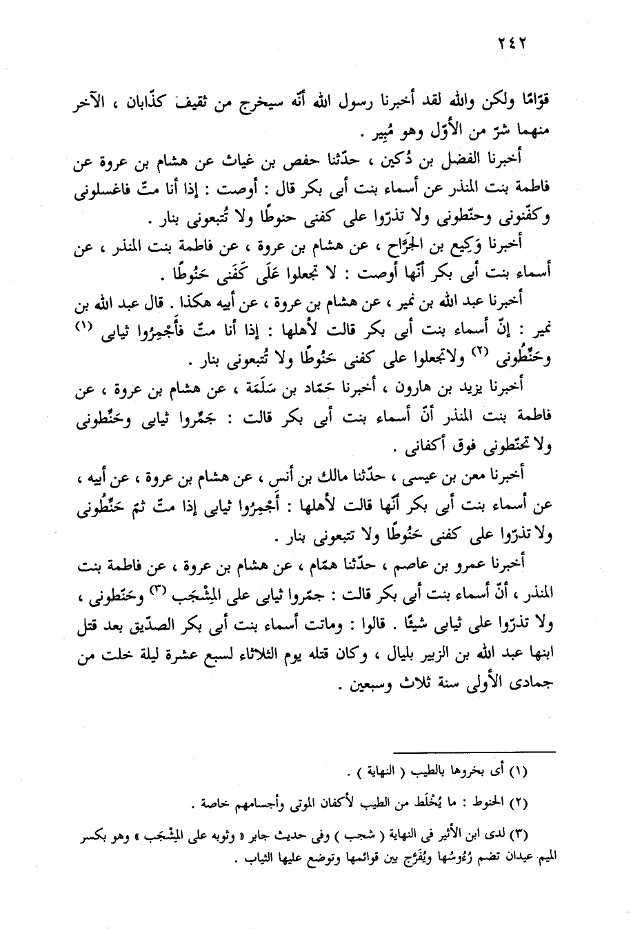 أخبرنا الفضل بن دُكين، حدّثنا حفص بن غياث عن هشام بن عروة عن فاطمة بنت المنذر عن أسماء بنت أبى بكر قال: أوصت: إذا أنا متّ فاغسلونى وكفّنونى وحنّطونى ولا تذرّوا على كفنى حنوطًا ولا تُتبعونى بنار.