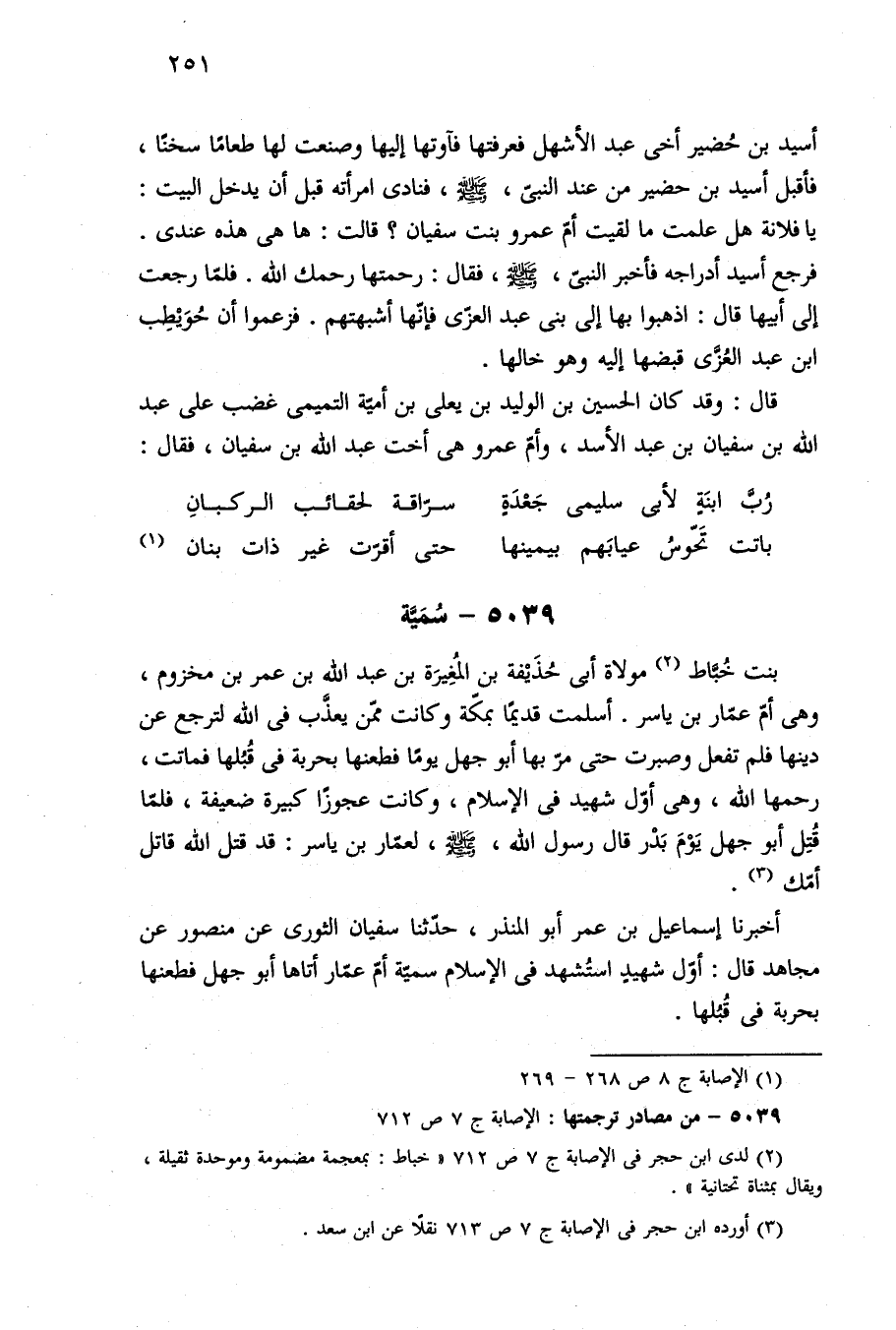 بنت خُبَّاط (¬٢) مولاة أبى حُذَيْفة بن المُغِيرَة بن عبد الله بن عمر بن مخزوم، وهي أمّ عمّار بن ياسر. أسلمت قديمًا بمكّة وكانت ممّن يعذَّب في الله لترجع عن دينها فلم تفعل وصبرت حتى مرّ بها أبو جهل يومًا فطعنها بحربة في قُبُلها فماتت، رحمها الله، وهى أوّل شهيد في الإسلام، وكانت عجوزًا كبيرة ضعيفة، فلمّا قُتل أبو جهل يَوْمَ بَدْر قال رسول الله، - صلى الله عليه وسلم -، لعمّار بن ياسر: قد قتل الله قاتل أمّك (¬٣).