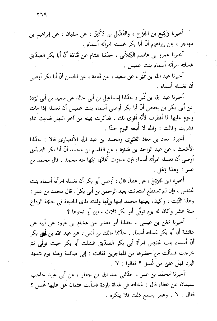 أخبرنا مَعْن بن عيسى، حدثنا أبو معشر عن هشام بن عروه عن أبيه عن عائشة أن أبا بكر غسلته أسماء. حدّثنا مالك بن أنس، عن عبد الله بن أبي بكر أنّ أسماء بنت عُمَيْس امرأة أبى بكر الصدّيق غسّلت أبا بكر حيت توفّى ثمّ خرجت فسألت من حضرها من المهاجرين فقالت: إنى صائمة وهذا يوم شديد البرد فهل عليّ من غُسل؟ فقالو: لا.