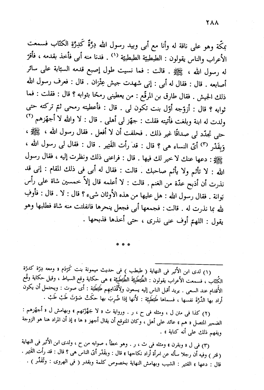 بمكّة وهو على ناقة له وأنا مع أبي وبيد رسول الله دِرَّةٌ كَدِرَّةِ الكتّاب فسمعت الأعراب والناس يقولون: الطبطبيّة الطبطبيّة (¬١). فدنا منه أى فأخذ بقدمه، فأقرّ له رسول الله، - صلى الله عليه وسلم -. قالت: فما نسيت طول إصبع قدمه السبّابة على سائر أصابعه. قال: فقال له أبى: إنى شهدت جيش عِثْرَان. قال: فعرف رسول الله ذلك الجيش. فقال طارف بن المرقّع: من يعطنى رمحًا بثوابه؟ قال: فقلت: فما ثوابه؟ قال: أزوّجه أوّل بنت تكون لى. قال: فأعطته رمحى ثمّ تركته حتى ولدت له ابنة وبلغت فأتيته فقلت: جهّز لى أهلى. قال: لا والله لا أجهّزهم (¬٢) حتى تجدّد لى صداقًا غير ذلك. فحلفت أن لا أفعل. فقال رسول الله، - صلى الله عليه وسلم -، وَيقَدْر (¬٣) أيّ النساء هى؟ قال: قد رأت القَتير. قال؟ فقال لى رسول الله، - صلى الله عليه وسلم -: دعها عنك لا خير لك فيها. قال: فراعنى ذلك ونظرت إليه، فقال رسول الله: لا تأثم ولا يأثم صاحبك. قالت: فقال له أبى في ذلك المقام: إنى قد نذرت أن أذبح عدّة من الغنم. قالت: لا أعلمه قال إلّا خمسين شاة على رأس بَوانة. فقال رسول الله: هل عليها من هذه الأوثان شئ؟ قال: لا. قال: فأوفِ لله بما نذرت له. قالت: فجمعها أبي فجعل ينحرها فانفلتت منه شاة فطلبها وهو يقول: اللهمّ أوف عنى نذرى، حتى أخذها فذبحها.