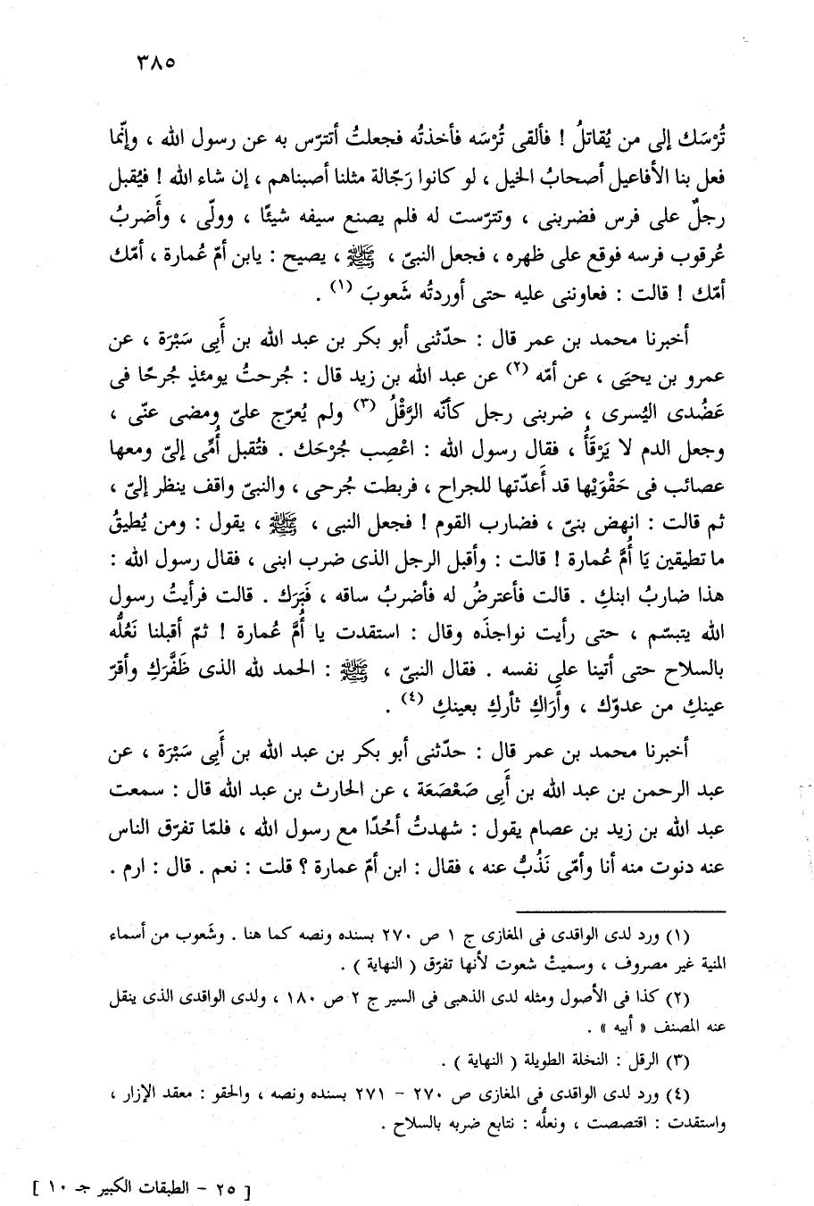 أخبرنا محمد بن عمر قال: حدّثنى أبو بكر بن عبد الله بن أَبِى سَبْرَة، عن عمرو بن يحيَى، عن أمّه (¬٢) عن عبد الله بن زيد قال: جُرحتُ يومئذٍ جُرحًا في عَضُدى اليُسرى، ضربنى رجل كأنّه الرَّقْلُ (¬٣) ولم يُعرّج عليّ ومضى عنّى، وجعل الدم لا يَرْقَأُ، فقال رسول الله: اعْصِب جُرْحَك. فتُقبل أُمِّى إليّ ومعها عصائب في حَقْوَيْها قد أَعدّتها للجراح، فربطت جُرحى، والنبيّ واقف ينظر إليّ، ثم قالت: انهض بنيّ، فضارب القوم! فجعل النبى، - صلى الله عليه وسلم -، يقول: ومن يُطيقُ ما تطقين يَا أُمَّ عُمارة! قالت: وأقبل الرجل الذى ضرب ابنى، فقال رسول الله: هذا ضاربُ ابنكِ. قالت فأعترضُ له فأضربُ ساقه، فَبَرَك. قالت فرأيتُ رسول الله يتبسّم، حتى رأيت نواجذَه وقال: استقدت يا أُمَّ عُمارة! ثمّ أقبلنا نَعُلُّه بالسلاح حتى أتينا على نفسه. فقال النبيّ، - صلى الله عليه وسلم -: الحمد لله الذى ظَفّرَكِ وأقرّ عينكِ من عدوّك، وأرَاكِ ثأركِ بعينكِ (¬٤).