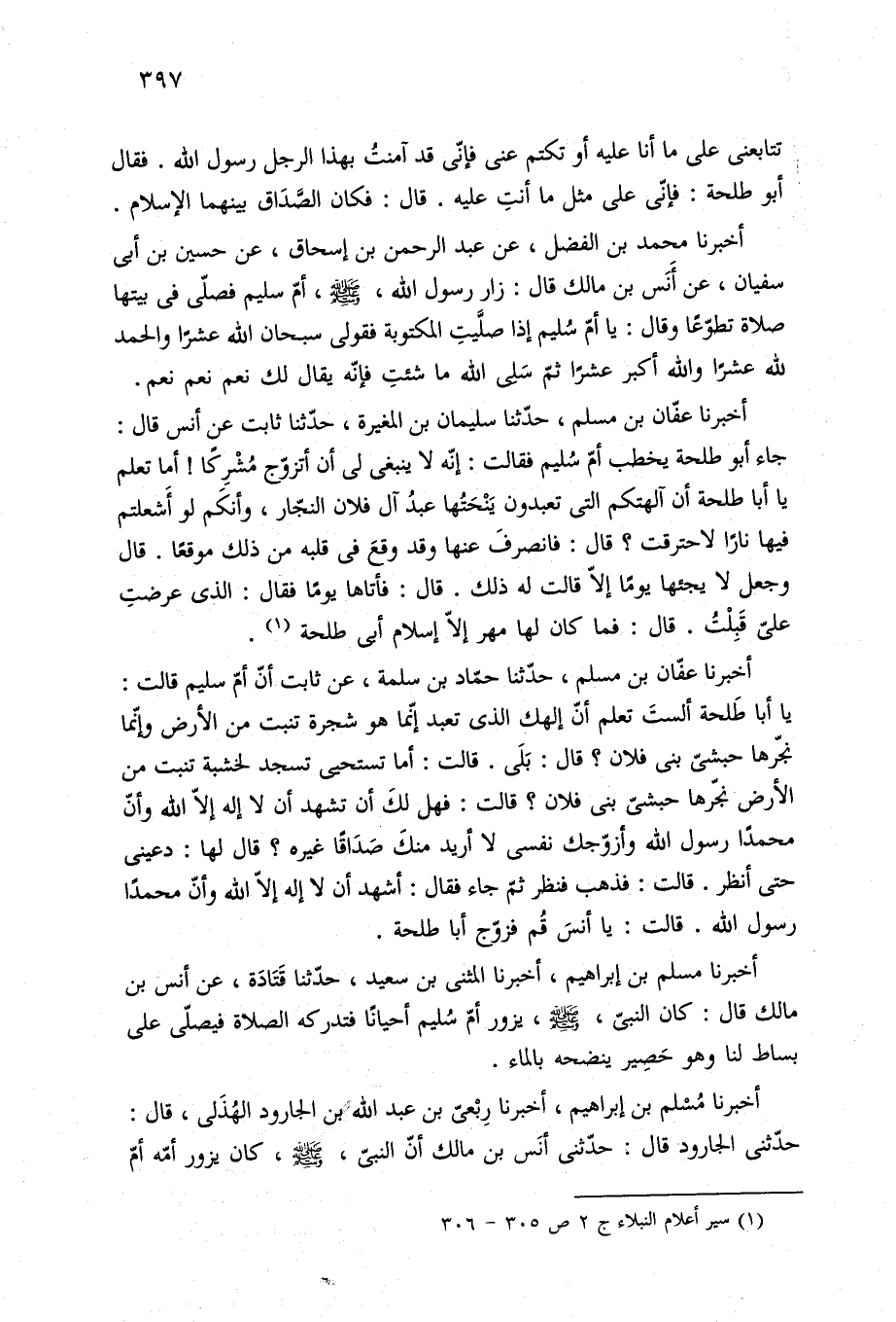 أخبرنا عفّان بن مسلم، حدّثنا حمّاد بن سلمة، عن ثابت أنّ أمّ سليم قالت: يا أبا طَلحة ألستَ تعلم أنّ إلهك الذى تعبد إنّما هو شجرة تنبت من الأرض وإنّما نجّرها حبشيّ بنى فلان؟ قال: بَلَى. قالت: أما تستحيى تسجد لخشبة تنبت من الأرض نجّرها حبشيّ بنى فلان؟ قالت: فهل لكَ أن تشهد أن لا إله إلّا الله وأنّ محمدًا رسول الله وأزوّجك نفسى لا أريد منكَ صَدَاقًا غيره؟ قال لها: دعينى حتى أنظر. قالت: فذهب فنظر ثمّ جاء فقال: أشهد أن لا إله إلّا الله وأنّ محمدًا رسول الله. قالت: يا أنسَ قُم فزوّج أبا طلحة.