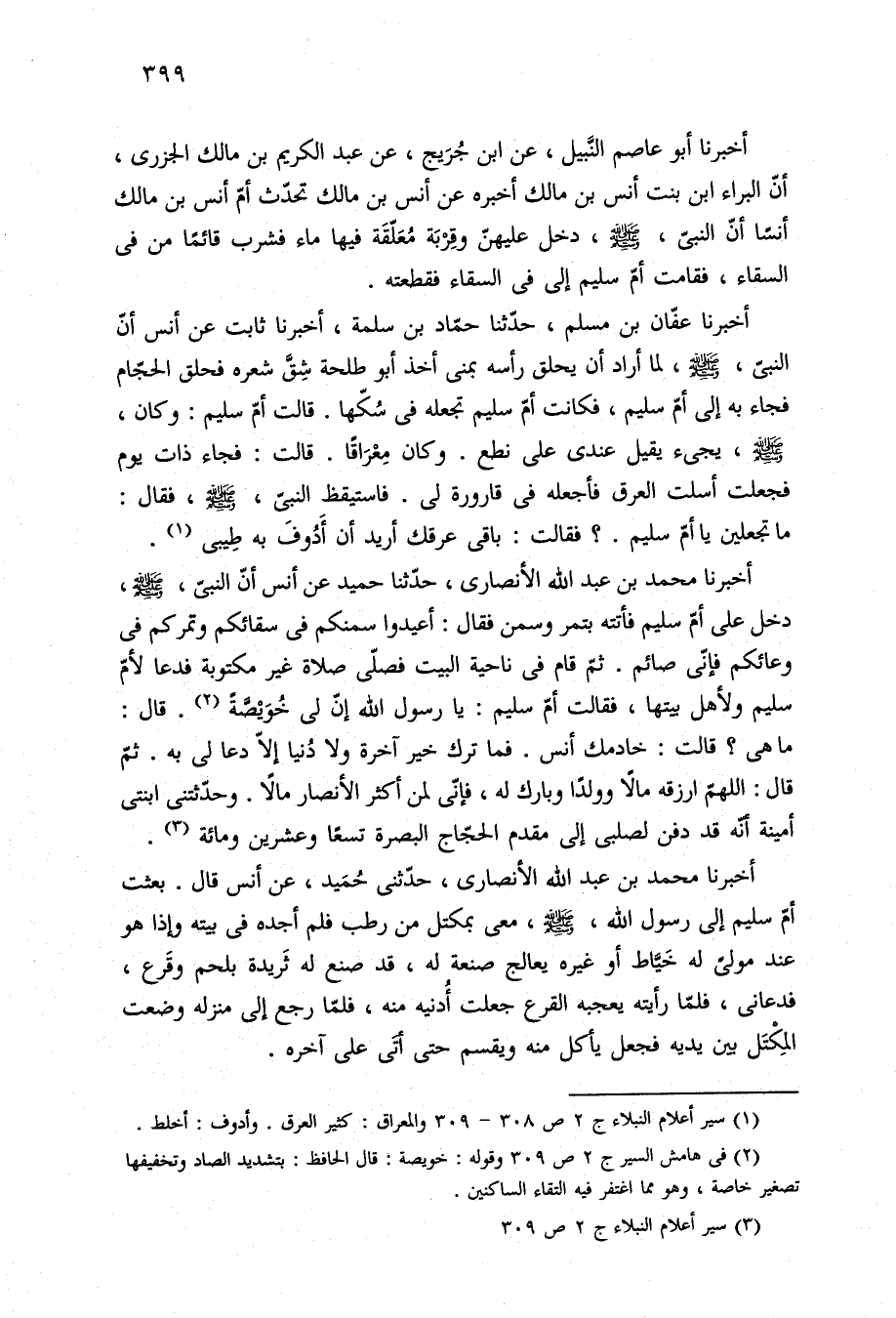أخبرنا عفّان بن مسلم، حدّثنا حمّاد بن سلمة، أخبرنا ثابت عن أنس أنّ النبيّ، - صلى الله عليه وسلم -، لما أراد أن يحلق رأسه بمنى أخذ أبو طلحة شِقَّ شعره فحلق الحجّام فجاء به إلى أمّ سليم، فكانت أمّ سليم تجعله في سُكّها. قالت أمّ سليم: وكان، - صلى الله عليه وسلم -، يجئ يقيل عندى على نطع. وكان مِعْرَاقًا. قالت: فجاء ذات يوم فجعلت أسلت العرق فأجعله في قارورة لى. فاستيقظ النبيّ، - صلى الله عليه وسلم -، فقال: ما تجعلين يا أمّ سليم.؟ فقالت: باقى عرقك أريد أن أَدُوفَ به طِيبى (¬١).