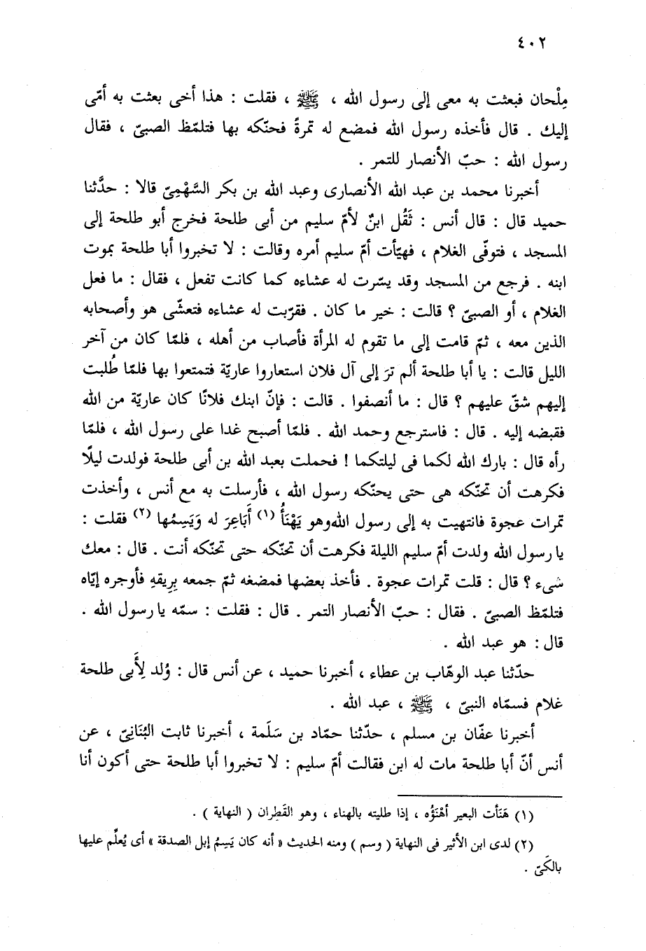 حدّثنا عبد الوهّاب بن عطاء، أخبرنا حميد، عن أنس قال: وُلد لِأبى طلحة غلام فسمّاه النبيّ، - صلى الله عليه وسلم -، عبد الله.