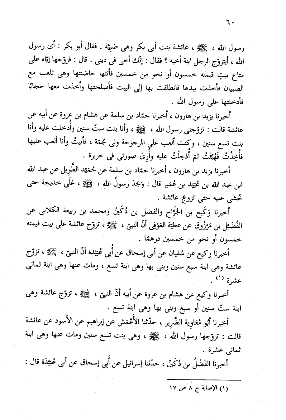 أخبرنا وكيع عن هشام بن عروة عن أبيه أنّ النبيّ، -صلى الله عليه وسلم-، تزوّج عائشة وهى ابنة ستّ سنين أو سبع وبنى بها وهى ابنة تسع.