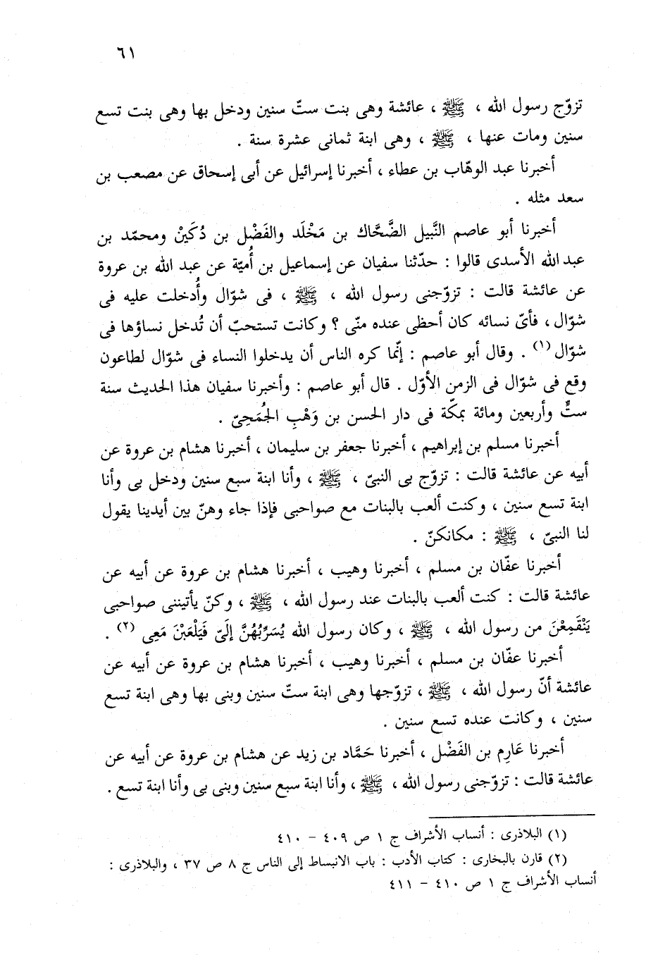 أخبرنا عفّان بن مسلم، أخبرنا وهيب، أخبرنا هشام بن عروة عن أبيه عن عائشة أنّ رسول الله، -صلى الله عليه وسلم-، تزوّجها وهى ابنة ستّ سنين وبنى بها وهي ابنة تسع سنين، وكانت عنده تسع سنين.
