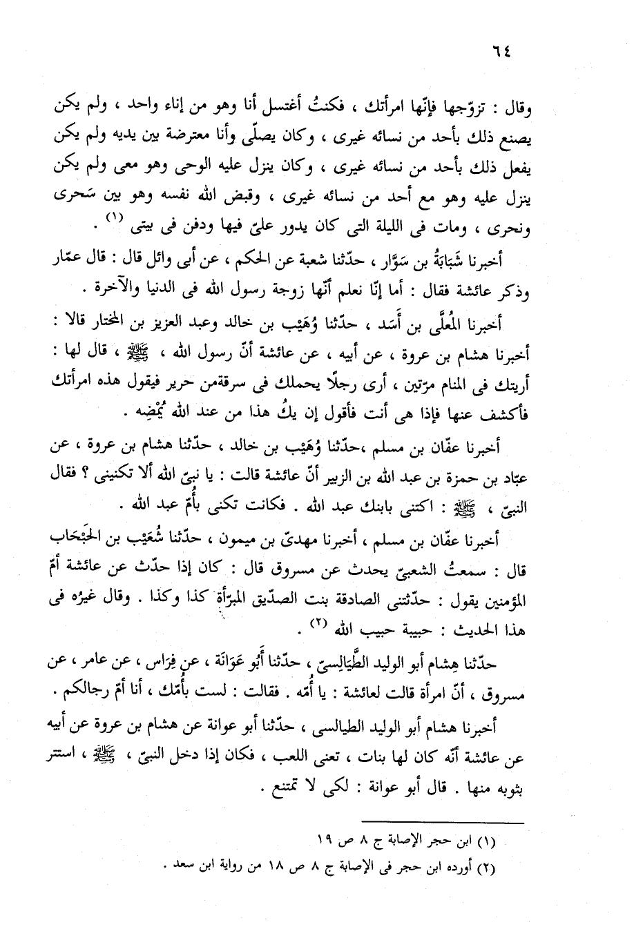 أخبرنا عفّان بن مسلم، حدّثنا وُهَيب بن خالد، حدّثنا هشام بن عروة، عن عبّاد بن حمزة بن عبد الله بن الزبير أنّ عائشة قالت: يا نبيّ الله ألا تكنينى؟ فقال النبيّ، -صلى الله عليه وسلم-: اكتنى بابنك عبد الله. فكانت تكنى بأُمّ عبد الله.