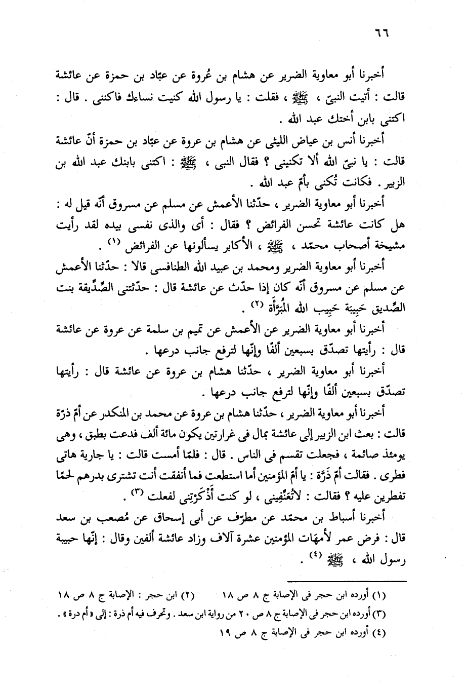 أخبرنا أنس بن عياض الليثى عن هشام بن عروة عن عبّاد بن حمزة أنّ عائشة قالت: يا نبيّ الله ألا تكنينى؟ فقال النبى، -صلى الله عليه ويلم-، : اكتنى بابنك عبد الله بن الزبير. فكانت تُكنى بأمّ عبد الله.