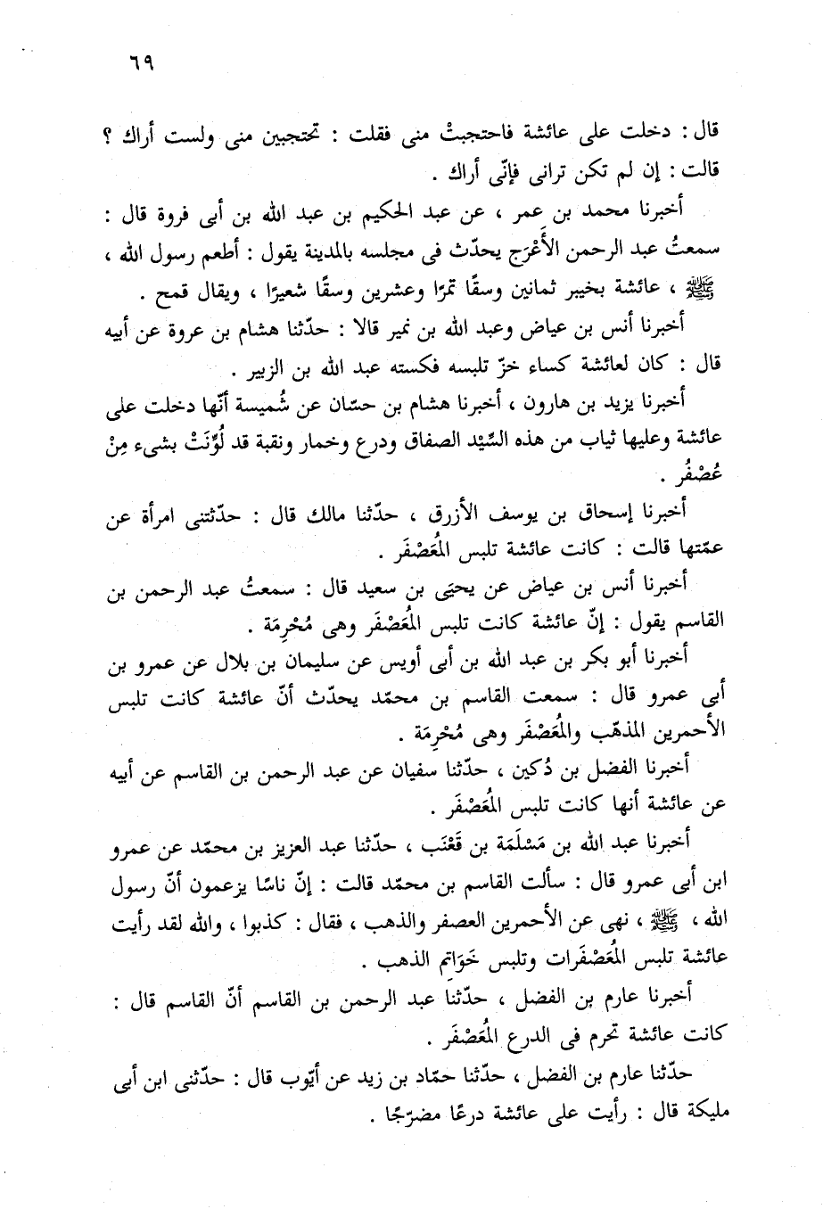 أخبرنا عبد الله بن مَسْلَمَة بن قَعْنَب، حدّثنا عبد العزيز بن محمّد عن عمرو بن أبى عمرو قال: سألت القاسم بن محمّد قالت: إنّ ناسًا يزعمون أنّ رسول الله، -صلى الله عليه وسلم-، نهى عن الأحمرين العصفر والذهب، فقال: كذبوا، والله لقد رأيت عائشة تلبس المُعَصْفَرات وتلبس خَوَاتِم الذهب.
