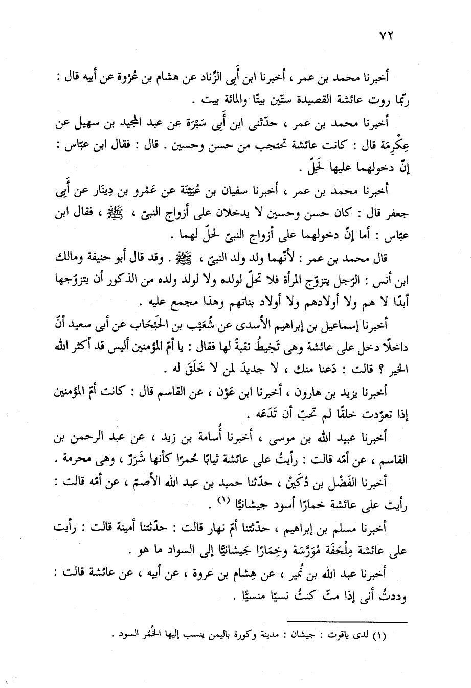 أخبرنا محمد بن عمر، أخبرنا ابن أَبى الزِّناد عن هشام بن عُزوة عن أبيه قال: ربّما روت عائشة القصيدة ستّين بيتًا والمائة بيت.