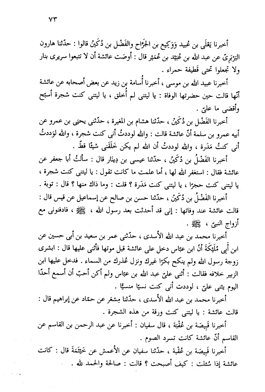 أخبرنا يَعْلَى بن عُبيد وَوَكِيع بن الجَرَّاح والفَضْل بن دُكَيْن قالوا: حدّثنا هارون البَرْبَرِيّ عن عبد الله بن عُبَيْد بن عُمَيْر قال: أوصَت عائشة أن لا تتبعوا سريرى بنار ولا تجعلوا تحتى قَطيفة حمراء.