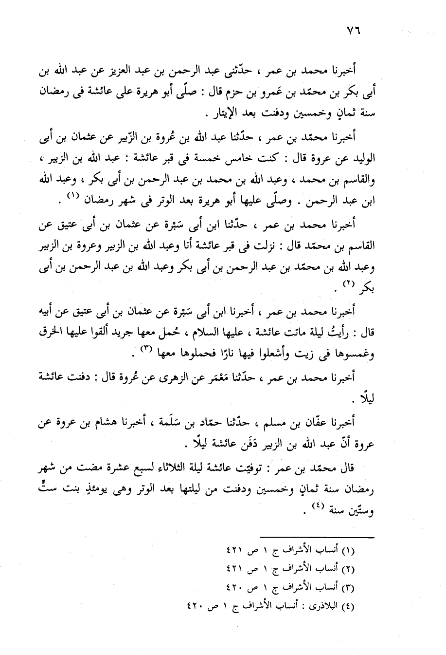 أخبرنا عفّان بن مسلم، حدّثنا حمّاد بن سَلَمة، أخبرنا هشام بن عروة عن عروة أنّ عبد الله بن الزبير دَفَن عائشة ليلًا.