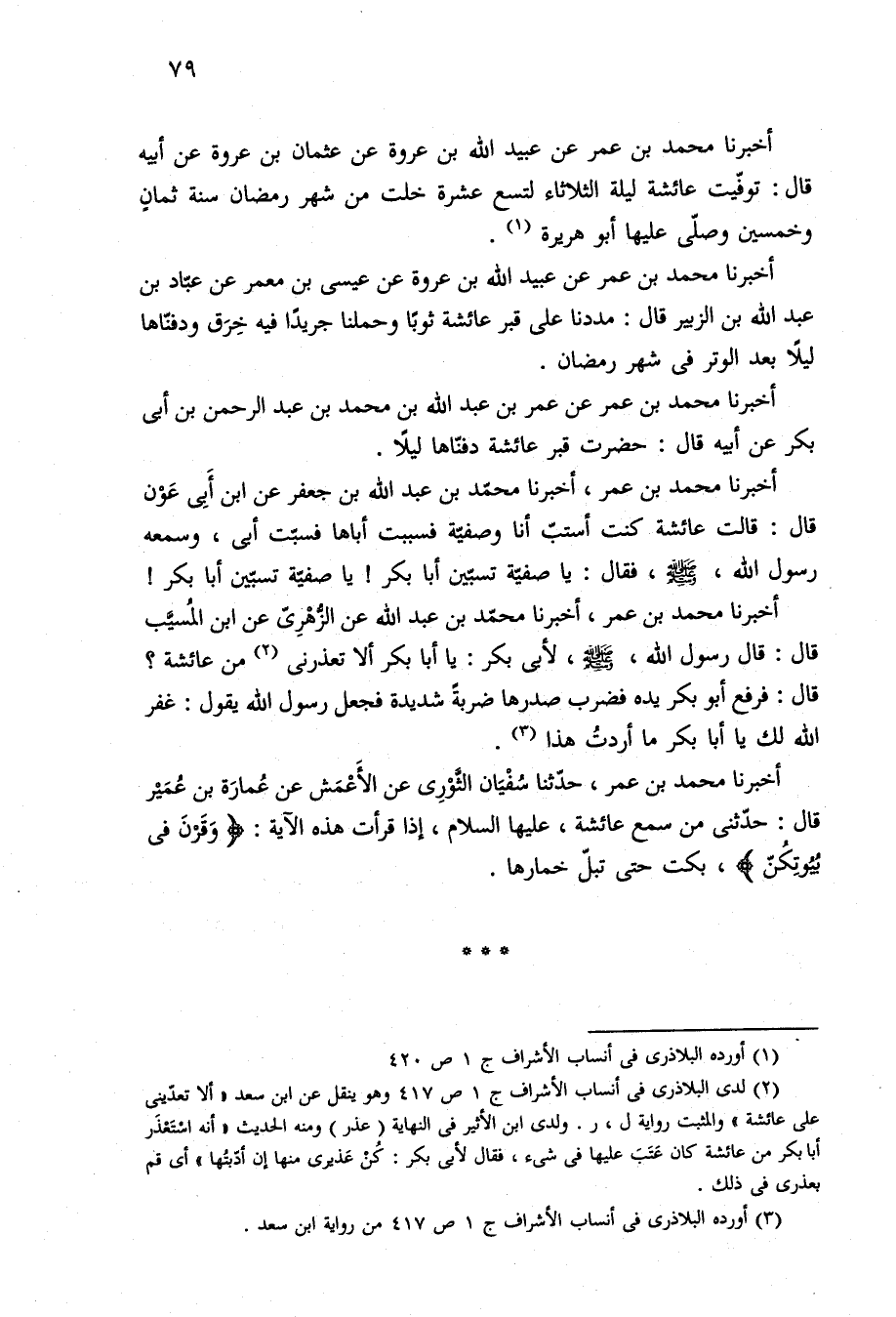 أخبرنا محمد بن عمر، أخبرنا محمّد بن عبد الله بن جعفر عن ابن أَبى عَوْن قال: قالت عائشة كنت أستبّ أنا وصفيّة فسببت أباها فسبّت أبى، وسمعه رسول الله، -صلى الله عليه وسلم-، فقال: يا صفيّة تسبّين أبا بكر! يا صفيّة تسبّين أبا بكر!