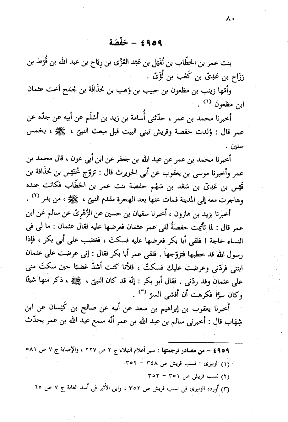 أخبرنا محمد بن عمر عن عبد الله بن جعفر عن ابن أبى عون، قال محمد بن عمر وأخبرنا موسى بن يعقوب عن أبى الحويرث قال: تزوّج خُنَيْس بن حُذَافة بن قَيس بن عَدِيّ بن سَعْد بن سَهْم حفصة بنت عمر بن الخطّاب فكانت عنده وهاجرت معه أبى المدينة فمات عنها بعد الهجرة مقدم النبيّ، -صلى الله عليه وسلم-، من بدر (¬٢).