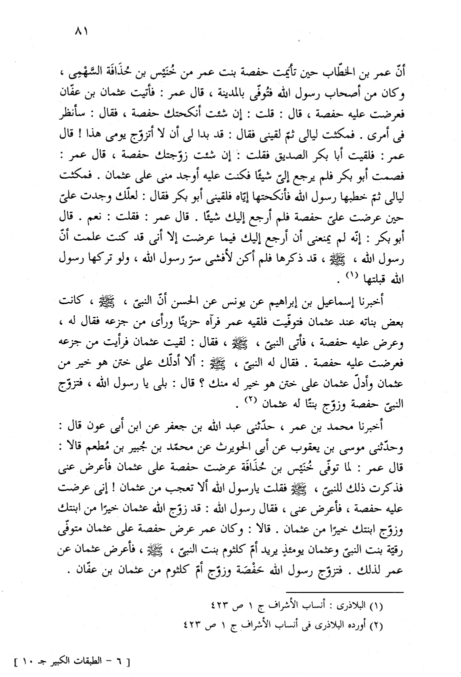 أخبرنا محمد بن عمر، حدّثنى عبد الله بن جعفر عن ابن أبى عون قال: وحدّثنى موسى بن يعقوب عن أبى الحويرث عن محمّد بن جُبير بن مُطعم قال: قال عمر: لما توفّى خُنَيْس بن حُذَافَة عرضت حفصة على عثمان فأعرض عنى فذكرت ذلك للنبيّ، -صلى الله عليه وسلم- فقلت يا رسول الله ألا تعجب من عثمان! إنى عرضت عليه حفصة، فأعرض عنى، فقال رسول الله: قد زوّج الله عثمان خيرًا من ابنتك وزوّج ابنتك خيرًا من عثمان. قال: وكان عمر عرض حفصة على عثمان متوفّى رقيّة بنت النبيّ وعثمان يومئذٍ يريد أمّ كلثوم بنت النبيّ، -صلى الله عليه وسلم-، فأعرض عثمان عن عمر لذلك. فتزوّج رسول الله حَفْصَة وزوّج أمّ كلثوم من عثمان بن عفّان.