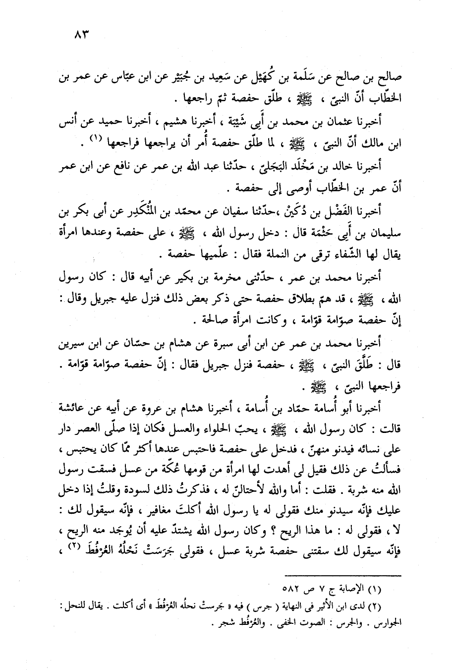 صالح بن صالح عن سَلَمة بن كُهَيل عن سَعِيد بن جُبَير عن ابن عبّاس عن عمر بن الخطّاب أنّ النبيّ، -صلى الله عليه وسلم-، طلّق حفصة ثمّ راجعها.