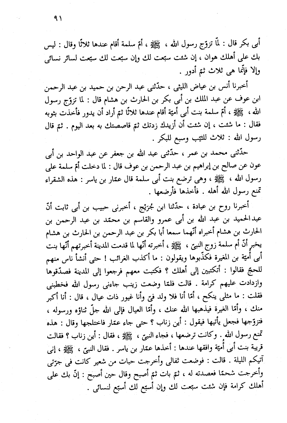أخبرنا أنس بن عياض الليثى، حدّثنى عبد الرحن بن حميد بن عبد الرحمن بن عوف عن عبد الملك بن أبى بكر بن الحارث بن هشام قال: لما تزوّج رسول الله، -صلى الله عليه وسلم-، أمّ سلمة بنت أبى أميّة أقام عندها ثلاثًا ثمّ أراد أن يدور فأخذت بثوبه فقال: ما شئت، إن شئت أن أزيدك زدتك ثمّ قاصصتك به بعد اليوم. ثمّ قال رسول الله: ثلاث للثيّب وسبع للبكر.