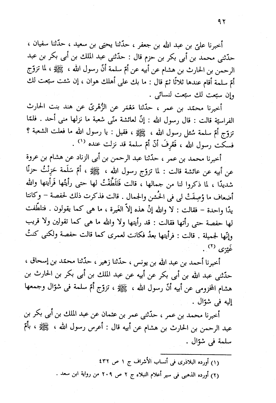 أخبرنا أحمد بن عبد الله بن يونس، حدّثنا زهير، حدّثنا محمّد بن إسحاق، حدّثنى عبد الله بن أبى بكر عن أبيه عن عبد الملك بن أبى بكر بن الحارث بن هشام المخزومى عن أبيه أنّ رسول الله، -صلى الله عليه وسلم-، تزوّج أمّ سلمة في شوّال وجمعها إليه في شوّال.