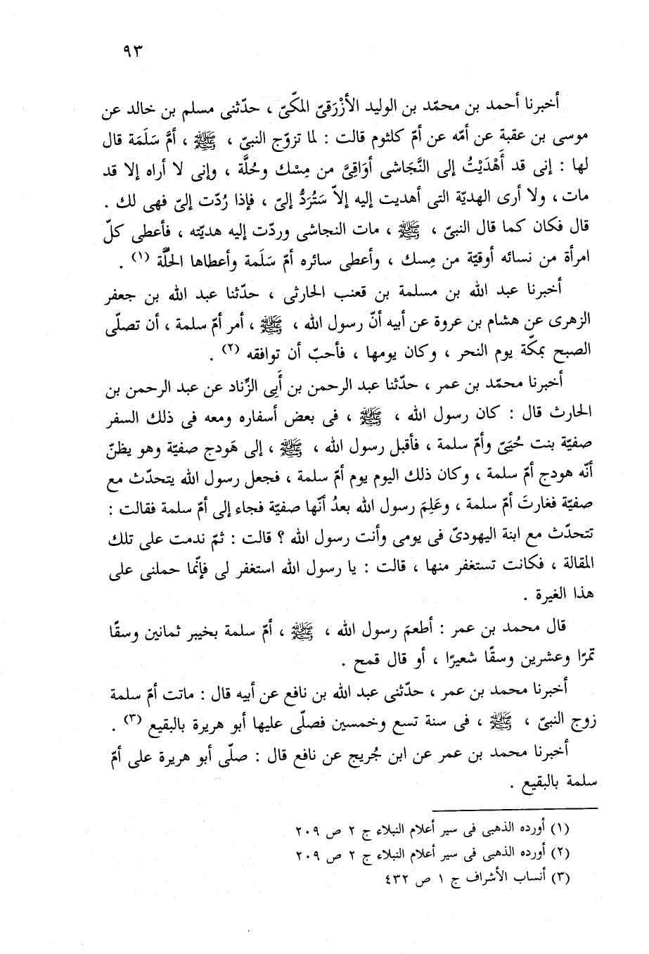 أخبرنا أحمد بن محمّد بن الوليد الأزْرَقيّ المكّيّ، حدّثنى مسلم بن خالد عن موسى بن عقبة عن أمّه عن أمّ كلثوم قالت: لما تزوّج النبيّ، -صلى الله عليه وسلم-، أمَّ سَلَمَة قال لها: إنى قد أَهْدَيْتُ إلى النَّجَاشى أوَاقِيَّ من مِشك وحُلَّة، وإنى لا أراه إلا قد مات، ولا أرى الهديّة التى أهديت إليه إلّا سَتُرَدُّ إليّ، فإذا رُدّت إليّ فهى لك. قال فكان كما قال النبيّ، -صلى الله عليه وسلم-، مات النجاشى وردّت إليه هديّته، فأعطى كلّ امرأة من نسائه أوقيّة من مِسك، وأعطى سائره أمّ سَلَمة وأعطاها الحُلَّة (¬١).