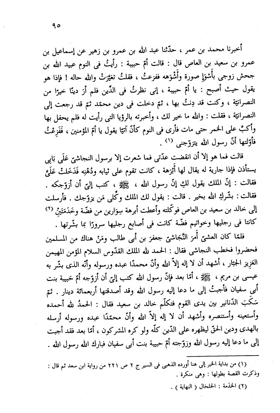 فلمّا كان العشيّ أَمرَ النَّجَاشيّ جعفرَ بن أبي طالب ومَنْ هناك من المسلمين فحضروا فخطب النجاشى فقال: الحمد لله الملك القدّوس السلام المؤمن المهيمن العَزِيز الجبّار، أشهد أن لا إله إلّا الله وأنّ محمدًا عبده ورسوله وأنّه الذى بشّر به عيسى بن مريم، -صلى الله عليه وسلم-، أمّا بعد فإنّ رسول الله كتب إليّ أن أزوّجه أمّ حَبيبة بنت أبي سفيان فأجبتُ إلى ما دعا إليه رسول الله وقد أصدقتها أربعمائة دينار. ثمّ سَكَت الدّنانير بين يدى القوم فتكلّم خالد بن سعيد فقال: الحمدُ لله أحمده وأستعينه وأستنصره وأشهد أن لا إله إلّا الله وأنّ محمّدا عبده ورسوله أرسله بالهدى ودين الحقّ ليظهره على الدّين كلّه ولو كره المشركون، أمّا بعد فقد أجبت إلى ما دعا إليه رسول الله وزوّجته أمّ حبيبة بنت أبي سفيان فبارك الله رسول الله.