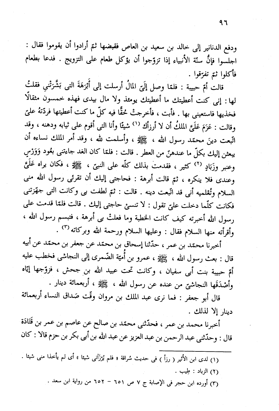 أخبرنا محمّد بن عمر، حدّثنا إسحاق بن محمّد عن جعفر بن محمّد عن أبيه قال: بعث رسول الله، -صلى الله عليه وسلم-، عمرو بن أُميّه الضّمرى إلى النجاشى فخطب عليه أمّ حبيبة بنت أبي سفيان، وكانت تحت عبيد الله بن جحش، فزوّجها إيّاه وأصْدَقَها النجاشيّ من عنده عن رسول الله، -صلى الله عليه وسلم-، أربعمائة دينار.