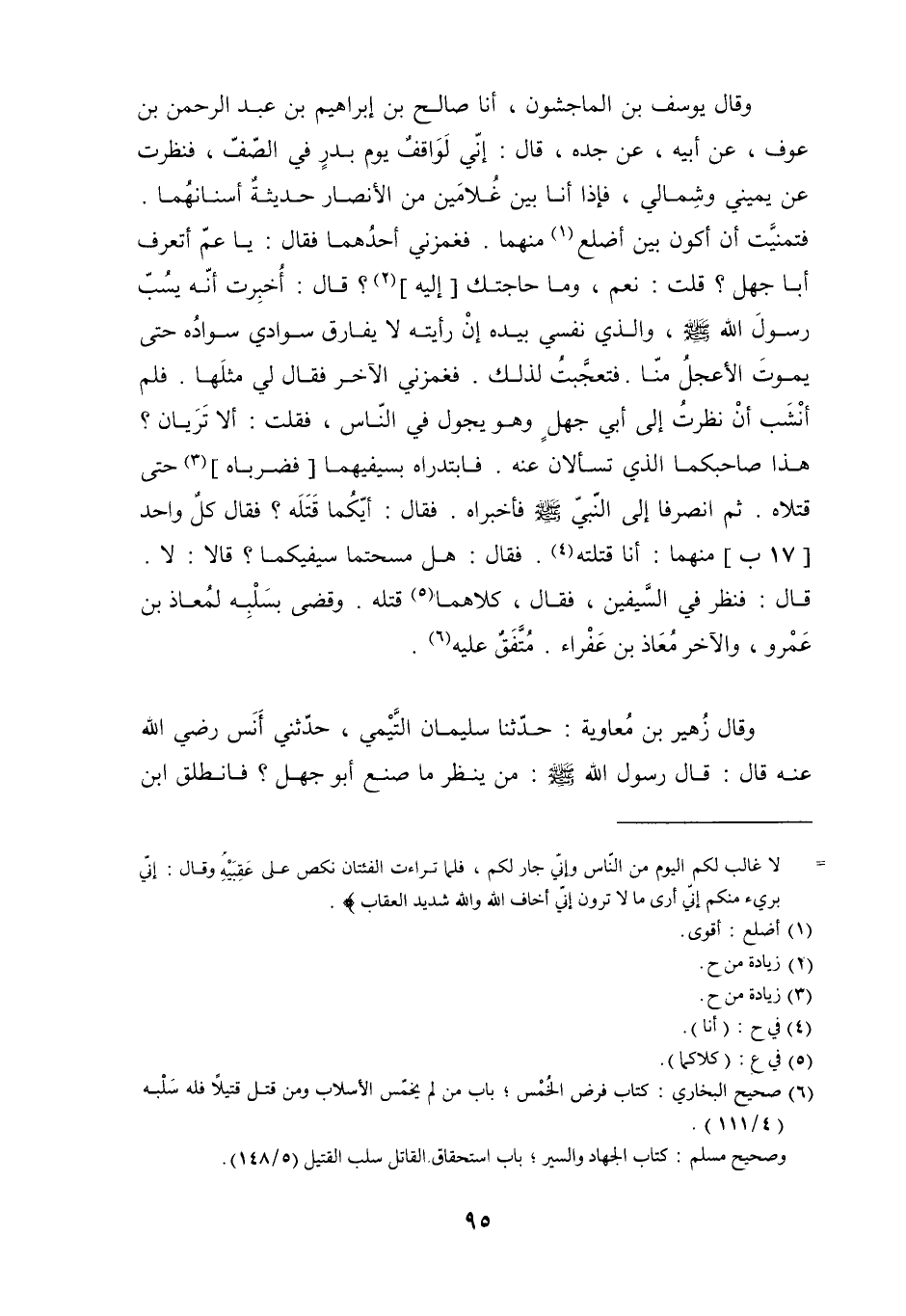 [1] انظر عنه: مسند أحمد 5/ 437- 444، السير والمغازي لابن إسحاق 87- 93، سيرة ابن هشام 1/ 247- 253، طبقات ابن سعد 4/ 75- 93، طبقات خليفة 7 و 140 و 189، المحبّر 75، تاريخ خليفة. 90، التاريخ الكبير 4/ 135، 136، المعارف 270، 271، الجرح والتعديل 4/ 296، 297، الكنى والأسماء للدولابي 1/ 78، المعرفة والتاريخ 3/ 272- 274، مشاهير علماء الأمصار 44 رقم 274، تاريخ أبي زرعة 1/ 648، 649، حلية الأولياء 1/ 185- 208، ذكر أخبار أصبهان 1/ 48- 57، الاستيعاب 2/ 56- 61، مقدّمة مسند بقيّ بن مخلد 85 رقم 56، تاريخ الرسل والملوك 1/ 93 وما بعدها و 2/ 566 وما بعدها، و 3/ 171 وما بعدها، و 4/ 11 وما بعدها، أنساب الأشراف 1/ 488، تاريخ بغداد 1/ 163- 171، تاريخ دمشق (مخطوط التيمورية) 16/ 92 و 24/ 378، تهذيب تاريخ دمشق 6/ 190- 211، الكامل في التاريخ 3/ 287، الروض الأنف للسهيلي 1/ 250، 251، صفة الصفوة 1/ 523- 555 رقم 59، التذكرة الحمدونية 1/ 130 و 138 و 144 تهذيب الأسماء واللغات ق 1 ج 1/ 226- 228، تهذيب الكمال 1/ 523، أسد الغابة 2/ 417، دول الإسلام 1/ 31، المعين في طبقات المحدّثين 21 رقم 49، الكاشف 1/ 304 رقم 2038، سير أعلام النبلاء 1/ 505- 558 رقم 91، مجمع الزوائد 9/ 332- 334، الوافي بالوفيات 15/ 309، 310 رقم 433، مرآة الجنان 1/ 100، عيون الأثر 1/ 60- 68، الوفيات لابن قنفذ 54، تهذيب التهذيب 4/ 137، تقريب التهذيب 1/ 315 رقم 346، الإصابة 2/ 62، 63 رقم 3357، خلاصة تذهيب التهذيب 147، كنز العمال 13/ 421، شذرات الذهب 1/ 44، موسوعة علماء المسلمين (من إعدادنا) 2/ 297- 299 رقم 641.