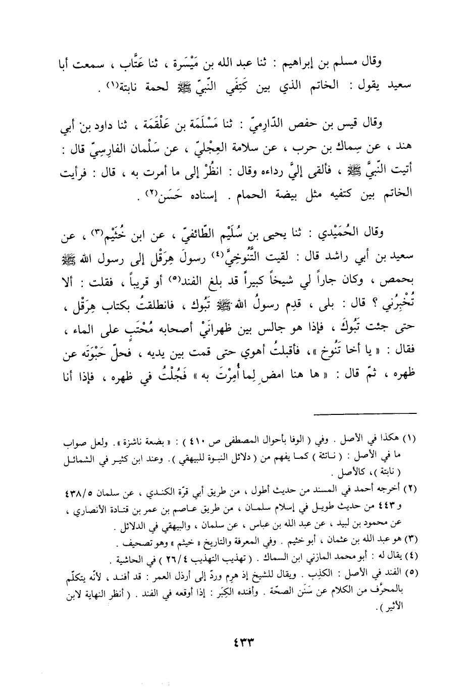[3] في الأصل: أحظنا. والتصحيح من معجم البلدان (جنفاء) وقد أورد الحديث بتمامه من رواية موسى بن عقبة التي هنا. وجنفاء: موضع في بلاد بني فزارة، وموضع بين خيبر وفيد، ذكرهما ياقوت 2/ 172 ونسب إليه السمهوري (2/ 283) قوله عن الموضع الثاني أنه هو الّذي وقع ذكره في غزوة خيبر. وليس في المطبوع ما يشير إلى ذلك.