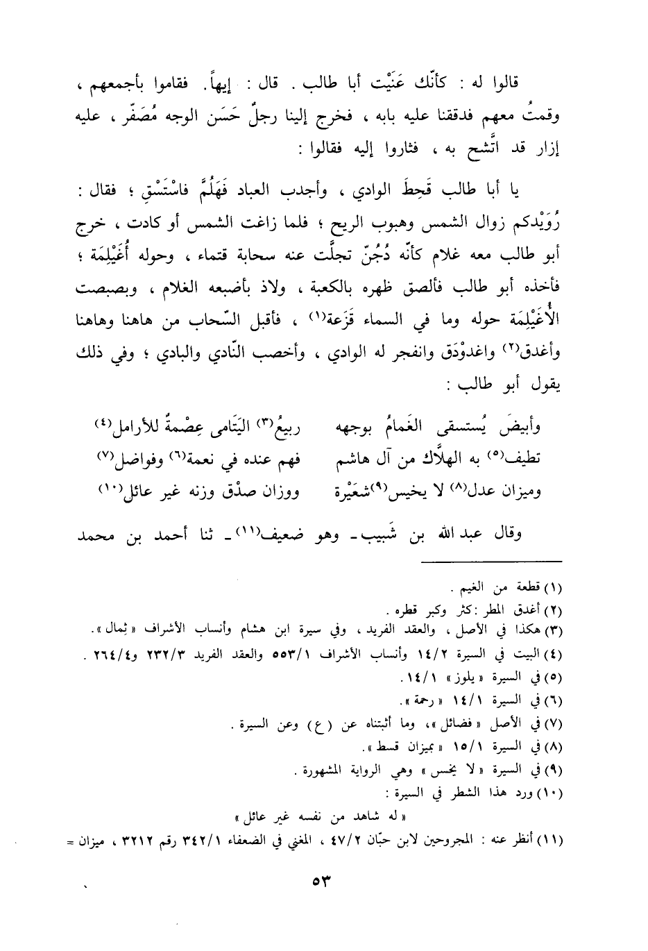 فِي شَنِّهِمَا [1] . وَمَجْدِيُّ بْنُ عَمْرٍو بِقُرْبِهِمَا لَمْ يَفْطِنَا بِهِ. فَسَمِعَا جَارِيَتَيْنِ مِنْ جَوَارِي الْحَيِّ تَقُولُ إِحْدَاهُمَا لِلْأُخْرَى: إِنَّمَا تَأْتِي الْعِيرُ غَدًا أَوْ بَعْدَ غَدٍ، فَأَعْمَلُ لَهُمْ ثُمَّ أَقْضِيكِ. فَصَرَفَهُمَا مَجْدِيُّ، وَكَانَ عَيْنًا لِأَبِي سُفْيَانَ. فَرَجَعَا إِلَى النَّبِيِّ صَلَّى اللَّهُ عَلَيْهِ وَسَلَّمَ فَأَخْبَرَاهُ. وَلَمَّا قَرُبَ أَبُو سُفْيَانَ مِنْ بَدْرٍ تَقَدَّمَ وَحْدَهُ حَتَّى أَتَى مَاءَ بَدْرٍ فَقَال لِمَجْدِيٍّ: هَلْ أَحْسَسْتَ أَحَدًا؟ فَذَكَرَ لَهُ الرَّاكِبَيْنِ. فَأَتَى أَبُو سُفْيَانَ مَنَاخَهُمَا، فَأَخَذَ مِنْ أَبْعَارِ بَعِيرَيْهِمَا فَفَتَّهُ، فَإِذَا فِيهِ النَّوَى، فَقَالَ: هَذِهِ وَاللَّهِ عَلَائِفُ يَثْرِبَ. فَرَجَعَ سَرِيعًا فَصَرَفَ الْعِيرَ عَنْ طَرِيقِهَا، وَأَخَذَ طَرِيقَ السَّاحِلِ، وَأَرْسَلَ يُخْبِرُ قُرَيْشًا أَنَّهُ قَدْ نَجَا فَارْجِعُوا. فَأَبَى أَبُو جَهْلٍ وَقَالَ: وَاللَّهِ لَا نَرْجِعُ حَتَّى نَرِدَ مَاءَ بَدْرٍ، وَنُقِيمَ عَلَيْهِ ثَلَاثًا، فَتَهَابُنَا الْعَرَبُ أَبَدًا.